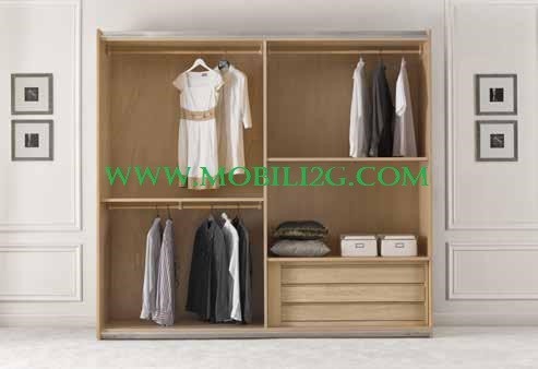 Armadio a 2 porte scorrevoli completo di 2 ripiani, 3 bastoni appendiabiti e 1 cassettiera interna a 3 cassetti.