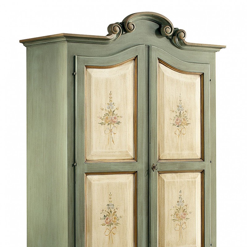 Armadio 2 ante battenti cappello sagomato con riccioli di legno e intarsio con gambe a cipolla