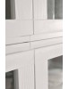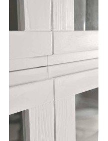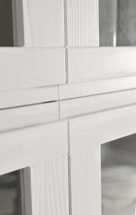 La verniciatura a poro aperto valorizza le venature naturali del legno, mentre la laccatura bianca delle ante e dei cassetti conferisce luminosità e leggerezza all'intera struttura.