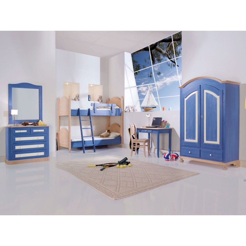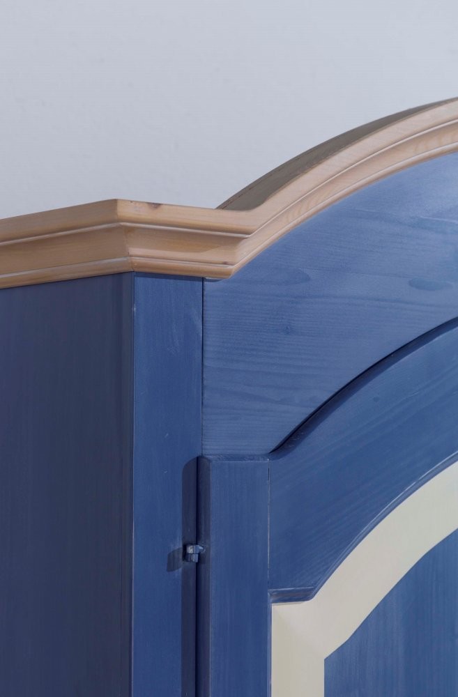 Armadio a 2 porte in Abete completo di un ripiano ed un bastone appendiabiti con finitura colore blu e particolari colore miele abete decapato.