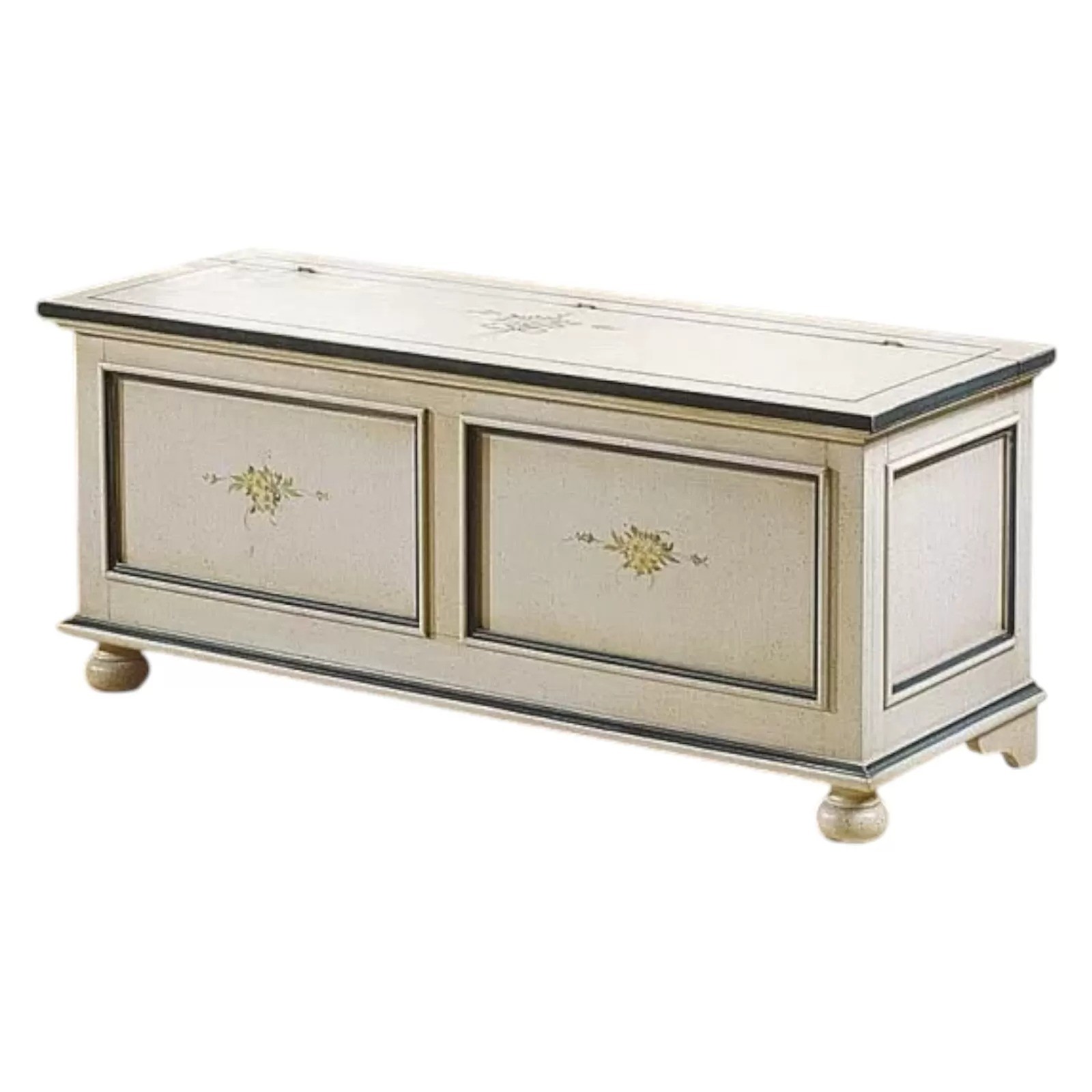 Cassapanca con finitura colore bianco e particolari colore azzurro e decorata.