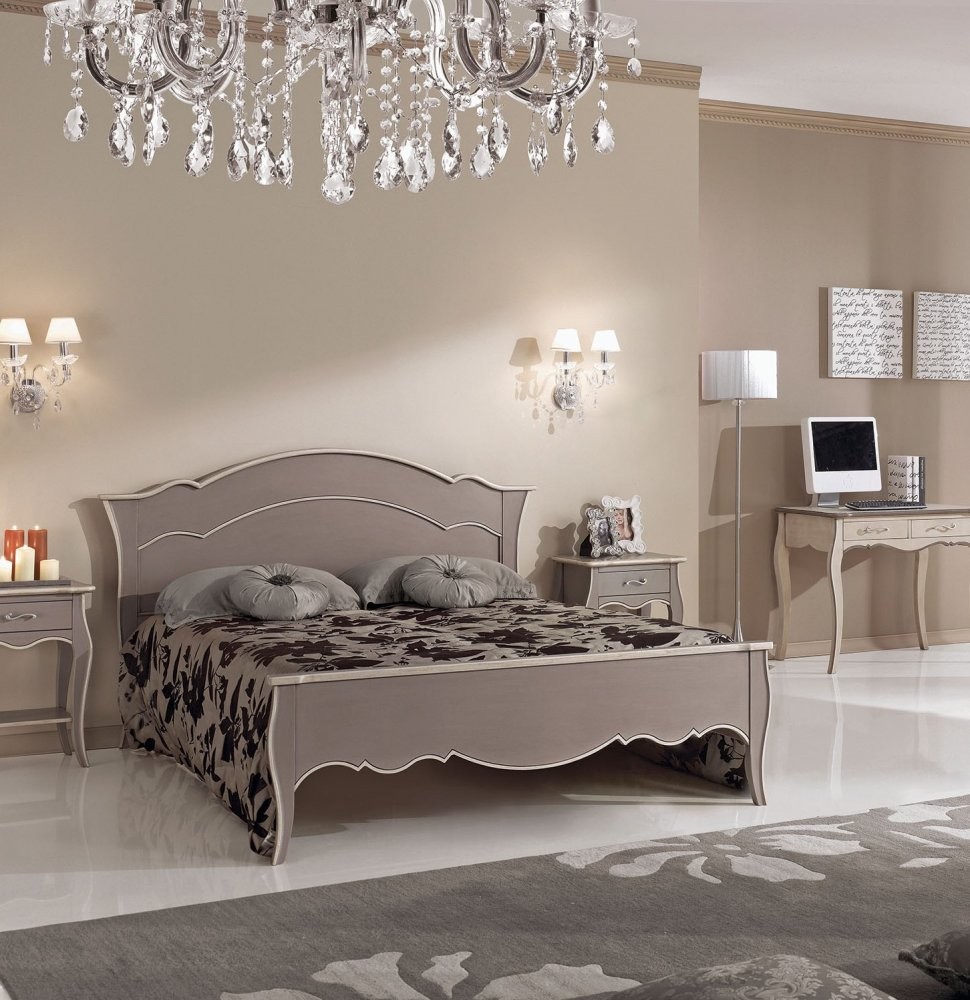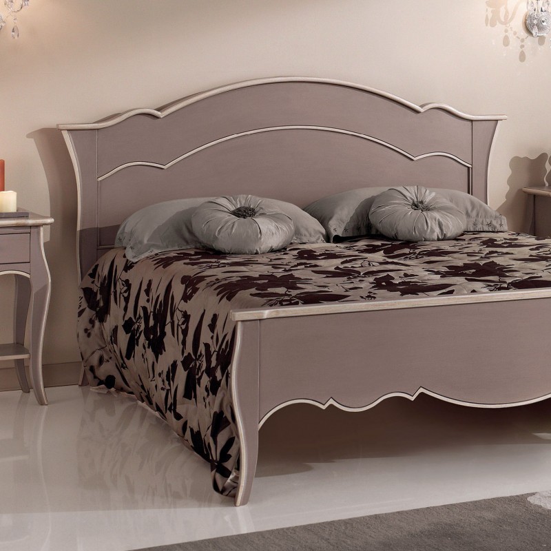 Letto matrimoniale decorato con finitura tortora anticato e profili colore avorio antico.