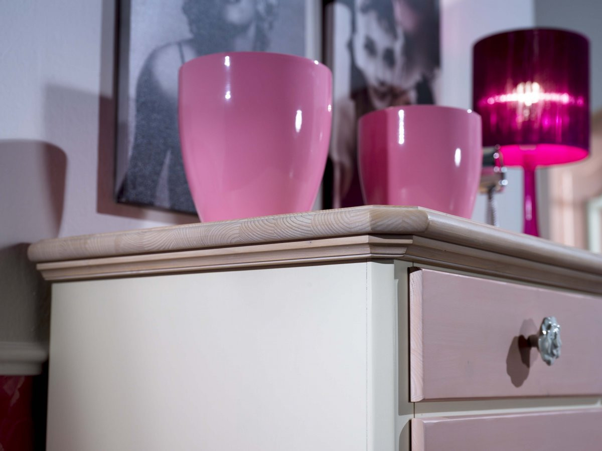 Comò a 5 cassetti laccato in Abete con finitura colore rosa e particolari colore "miele" abete decapato e colore "pelle uovo".