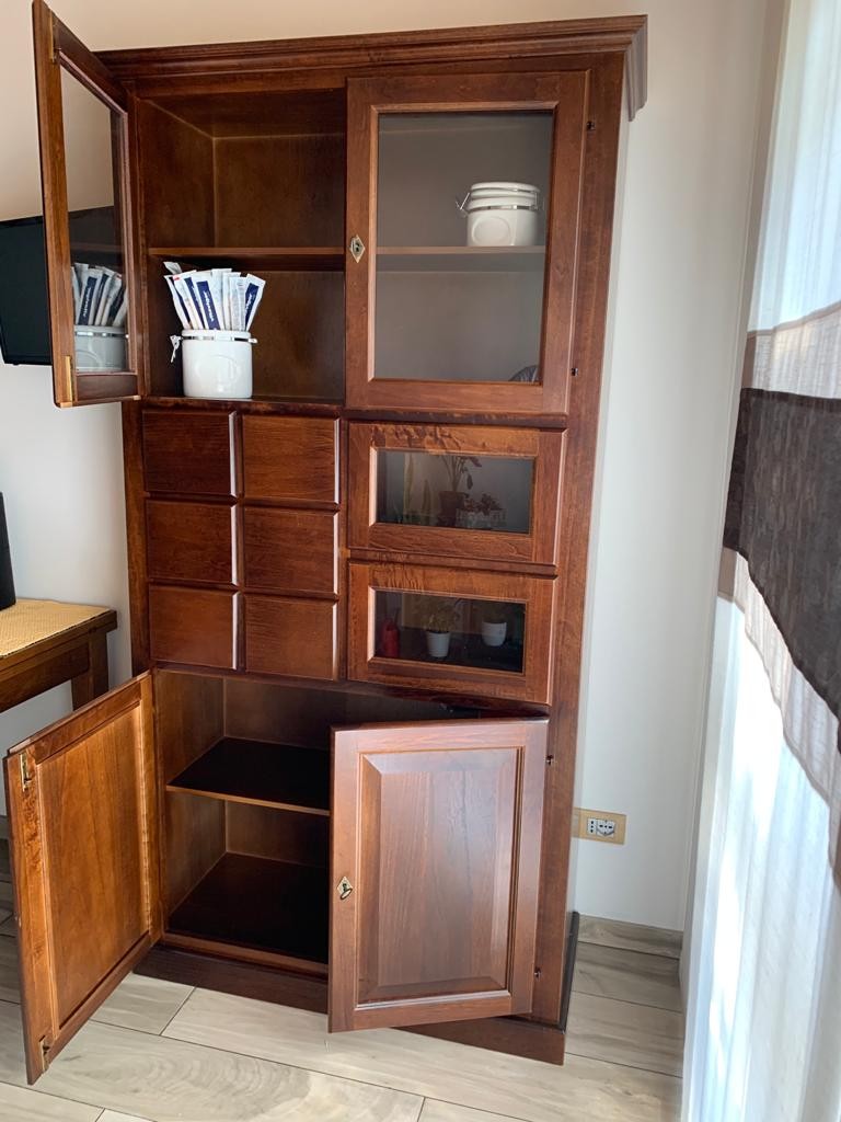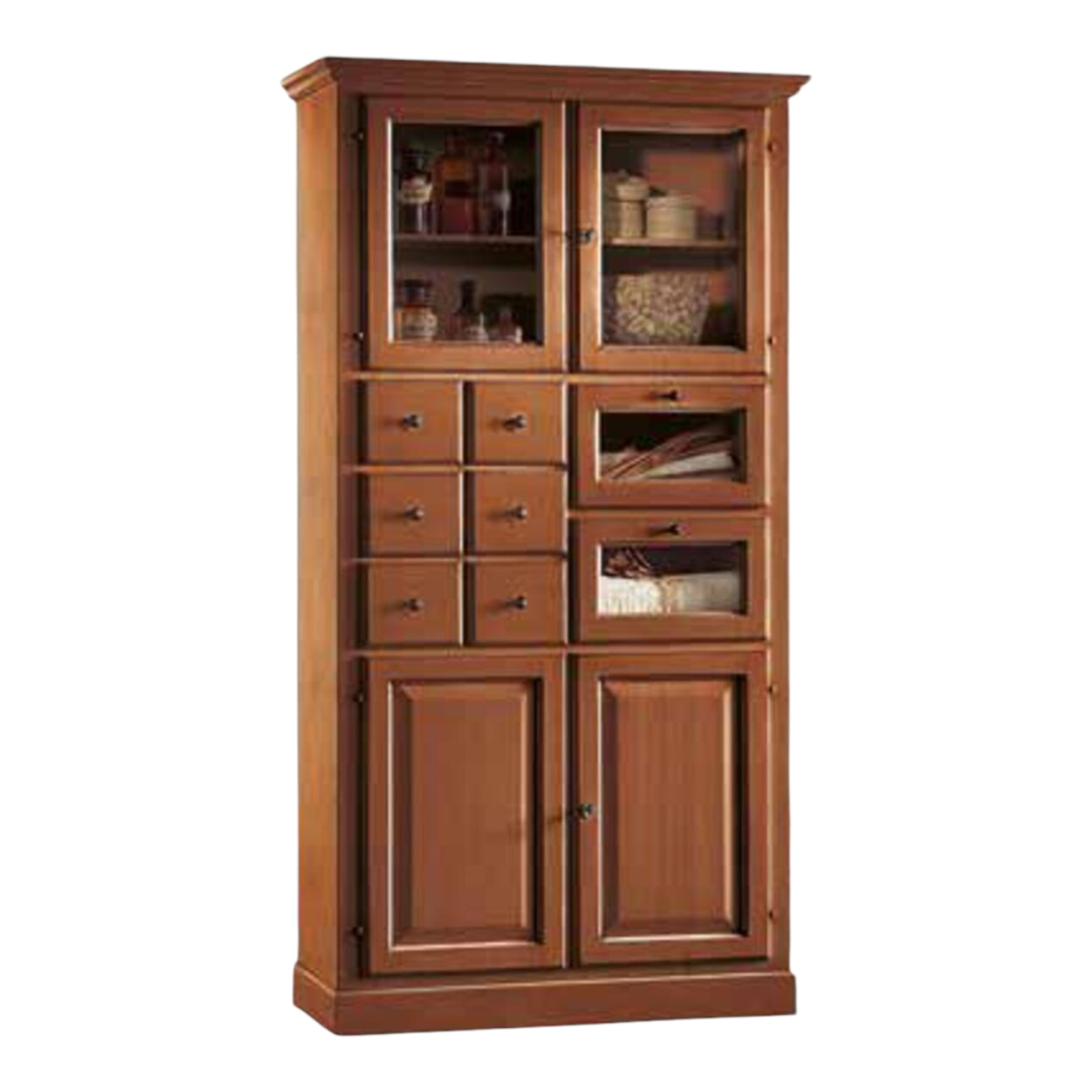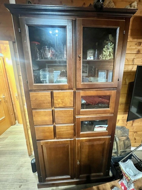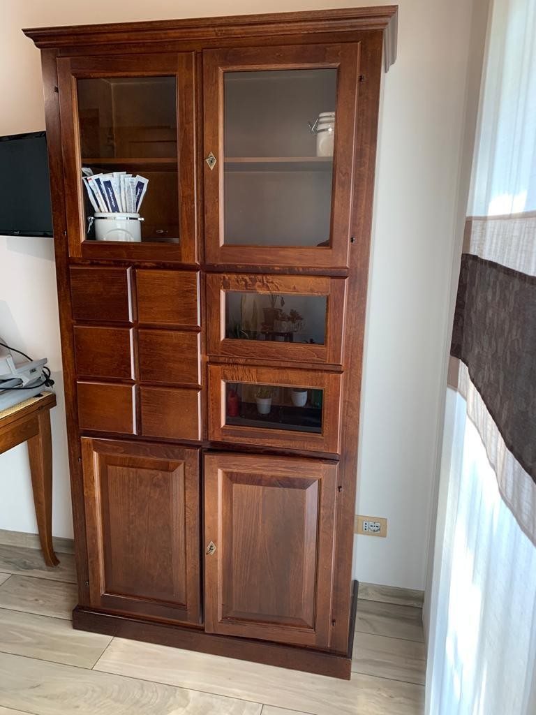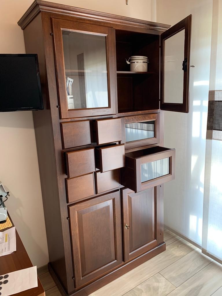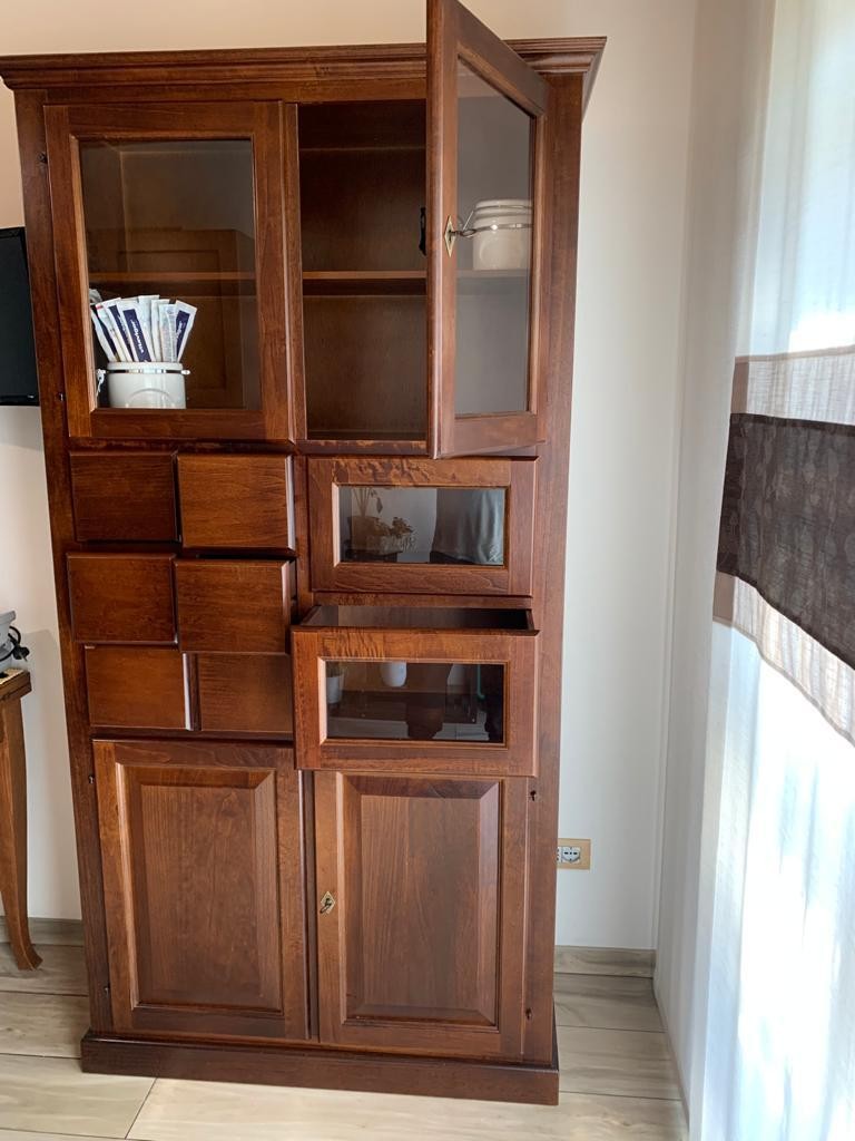 DESCRIZIONE : La dispensa è composta da 2 ante e 6 cassetti , 2 ante in vetro nella parte superiore e 2 cassetti in vetro. Le ante sono dotate di serratura.
