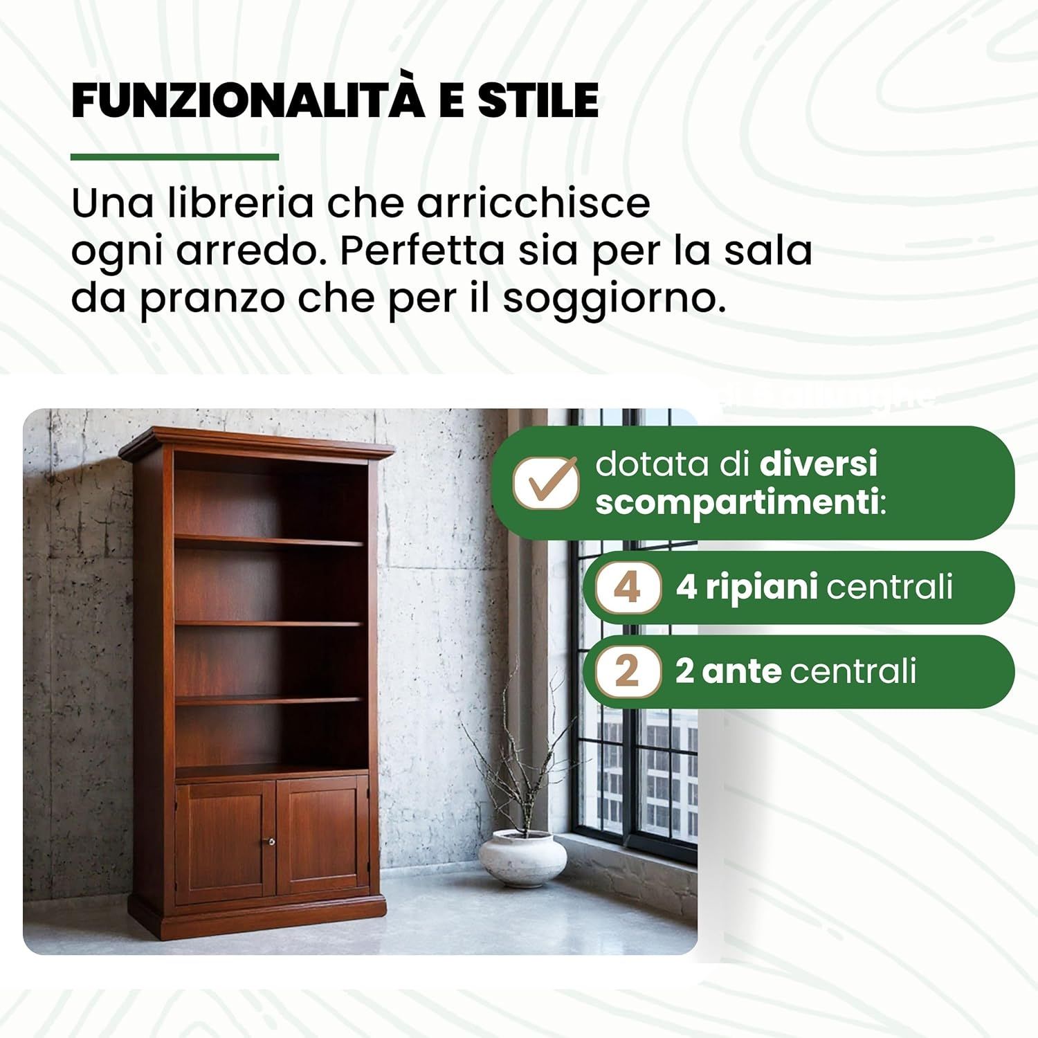 Spaziosa e, nello stesso tempo, compatta, questa meravigliosa libreria si adatta a diversi spazi e stili, dai contesti rustici a quelli più moderni.
