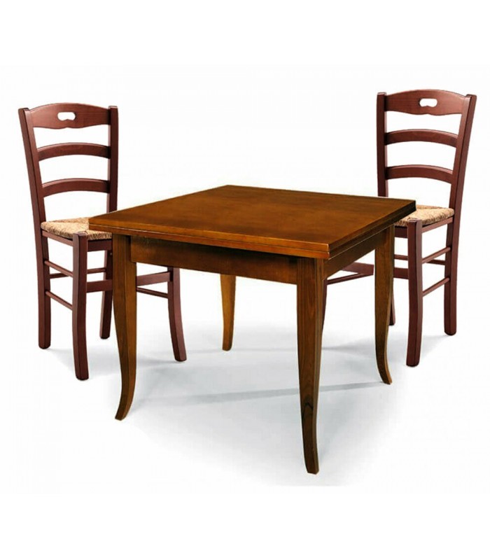 Tavolo costruito in legno massello di pioppo rendendo il mobile solido e allo stesso tempo elegante. Piano quadrato con gambe a sciabola. Dotato di un'apertura a libro con scorrimento per ospitare occasionalmente numerose persone per il pranzo o per la cena. Ideale per il soggiorno o in cucina.