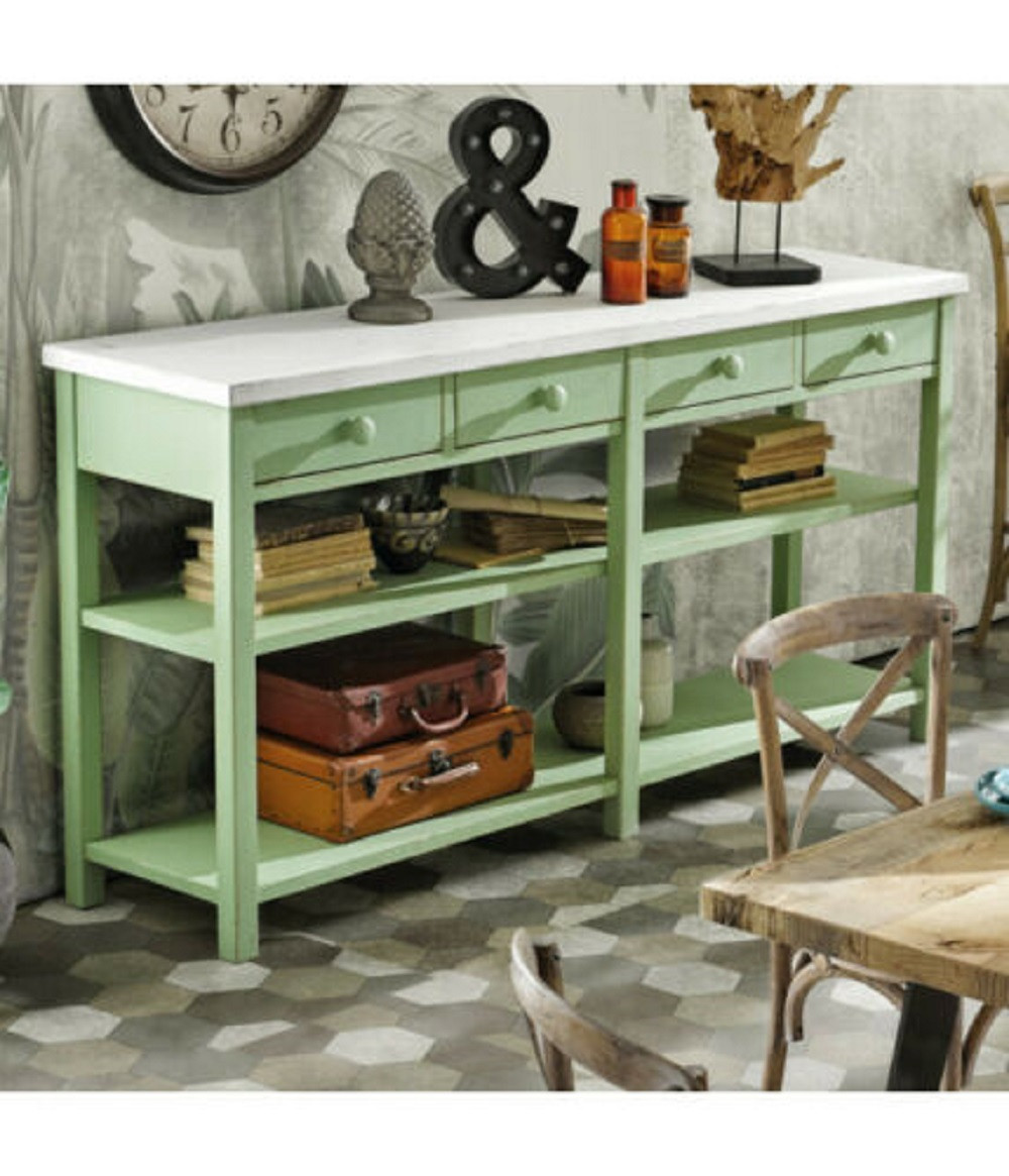 BANCONE 4 CASSETTI 2 RIPIANI SHABBY VERDE IN LEGNO MASSELLO