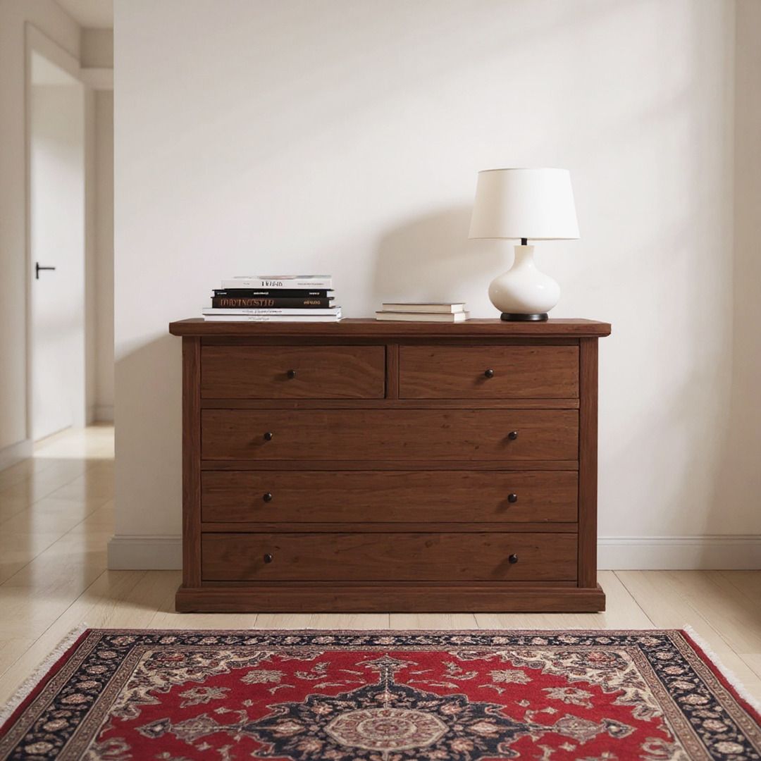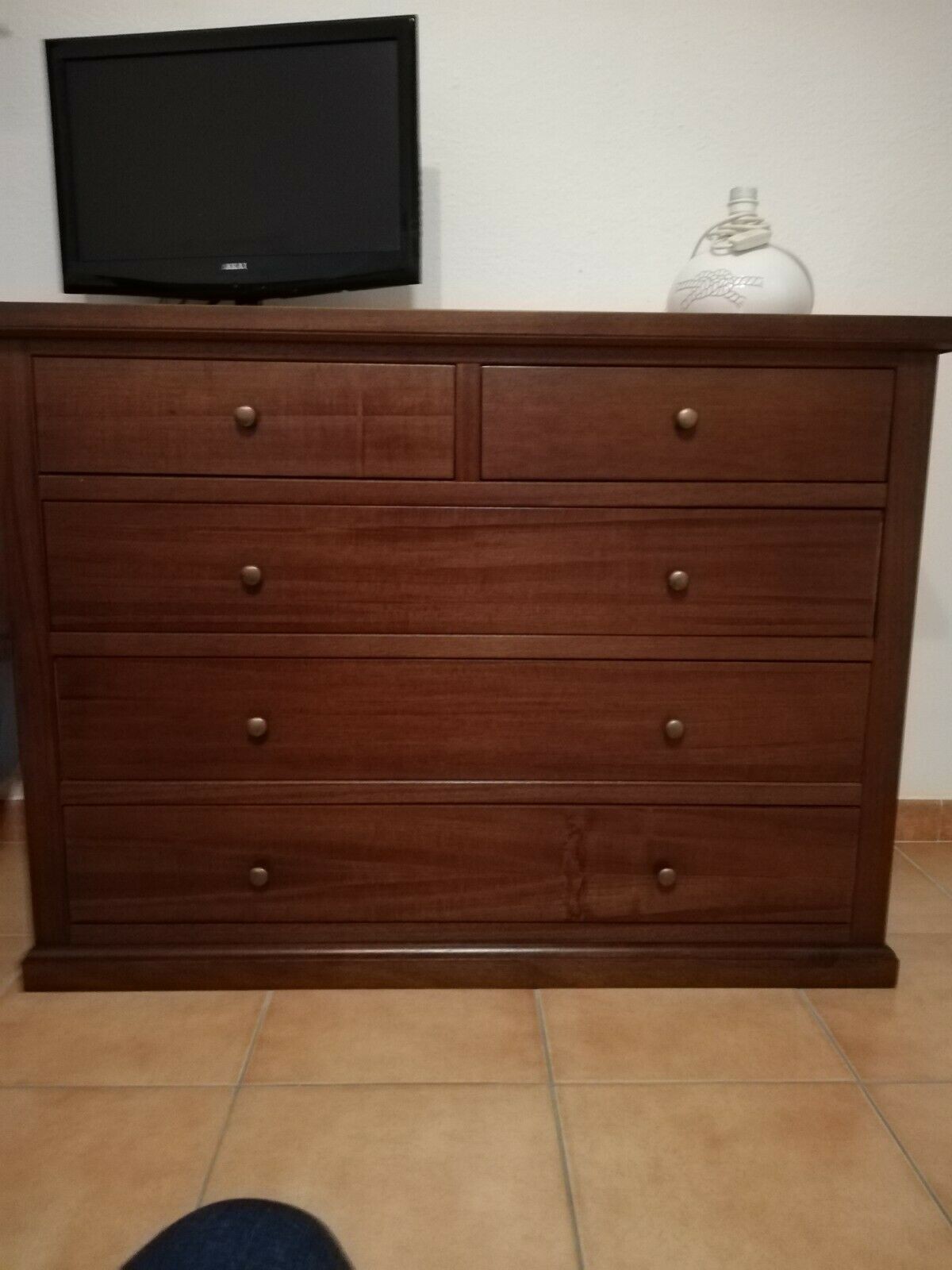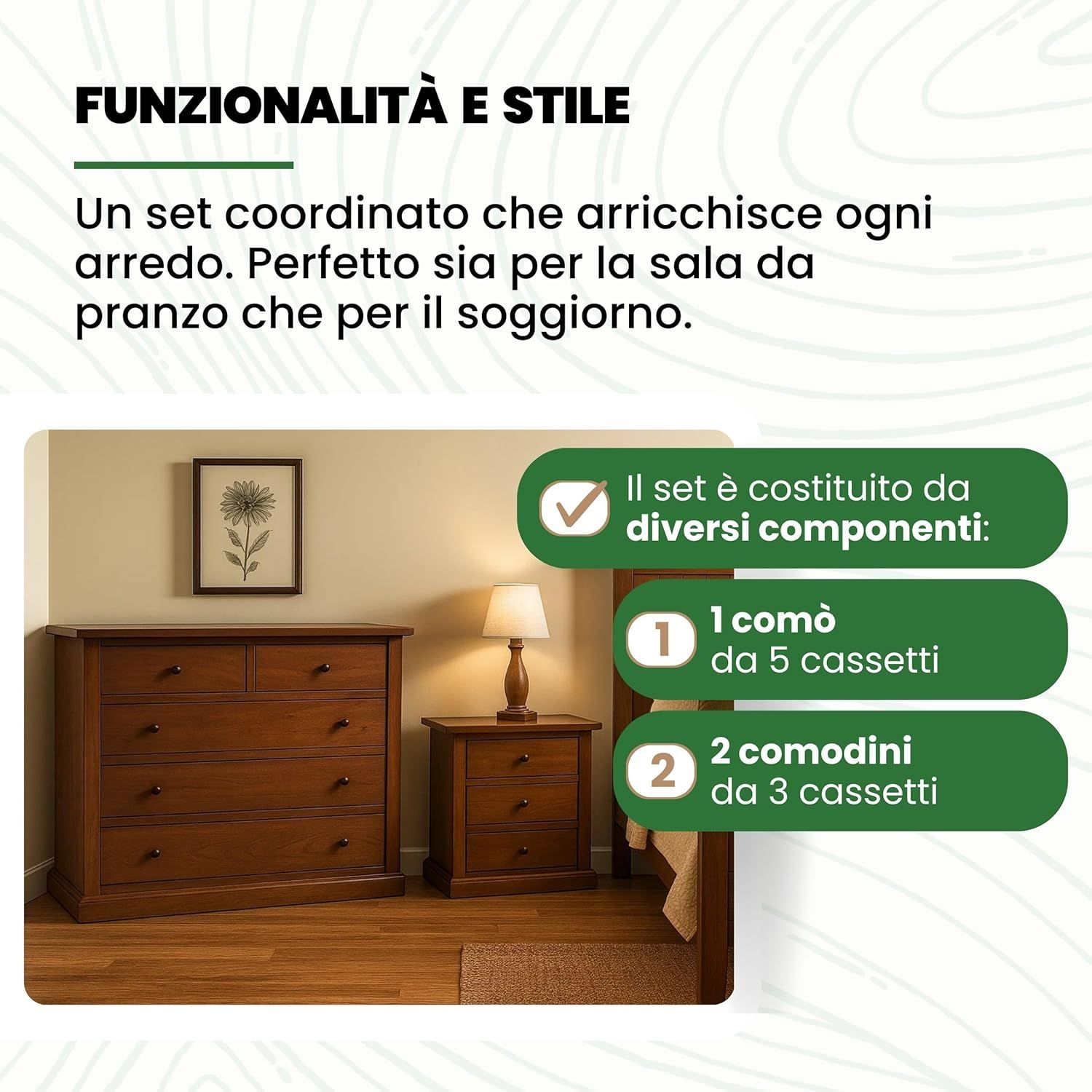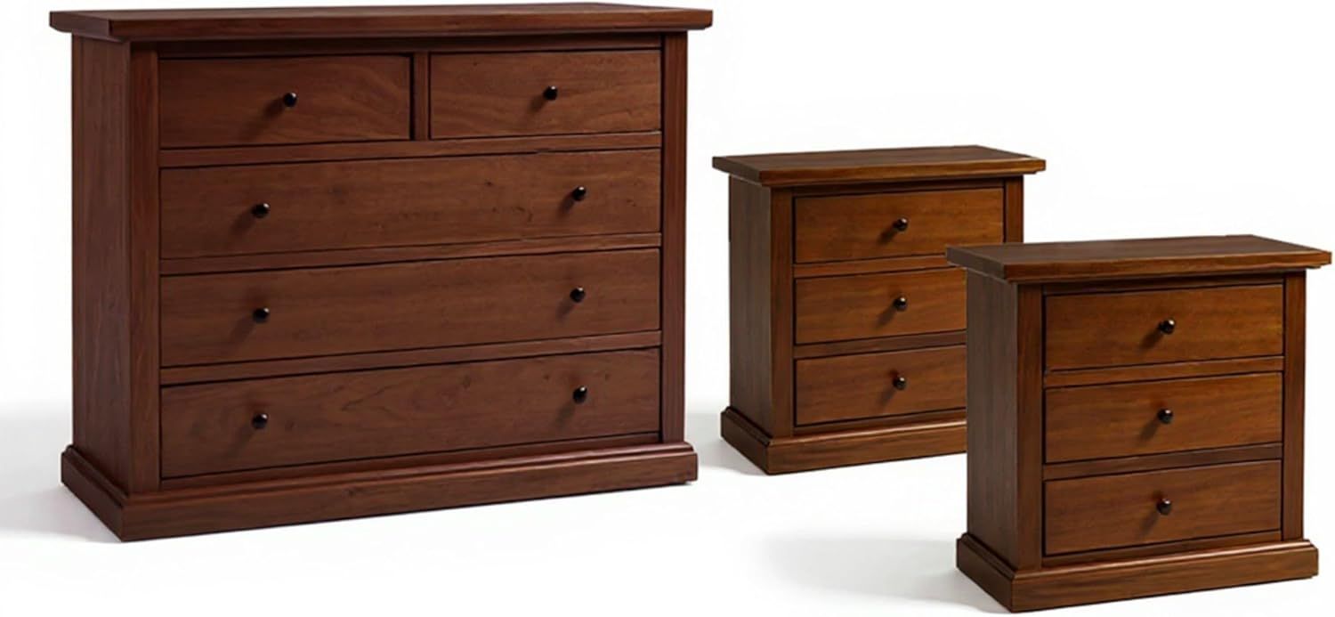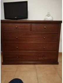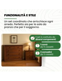 GRUPPO COMO'A 5 CASSETTI E 2 COMODINI A 3 CASSETTI TINTA NOCE