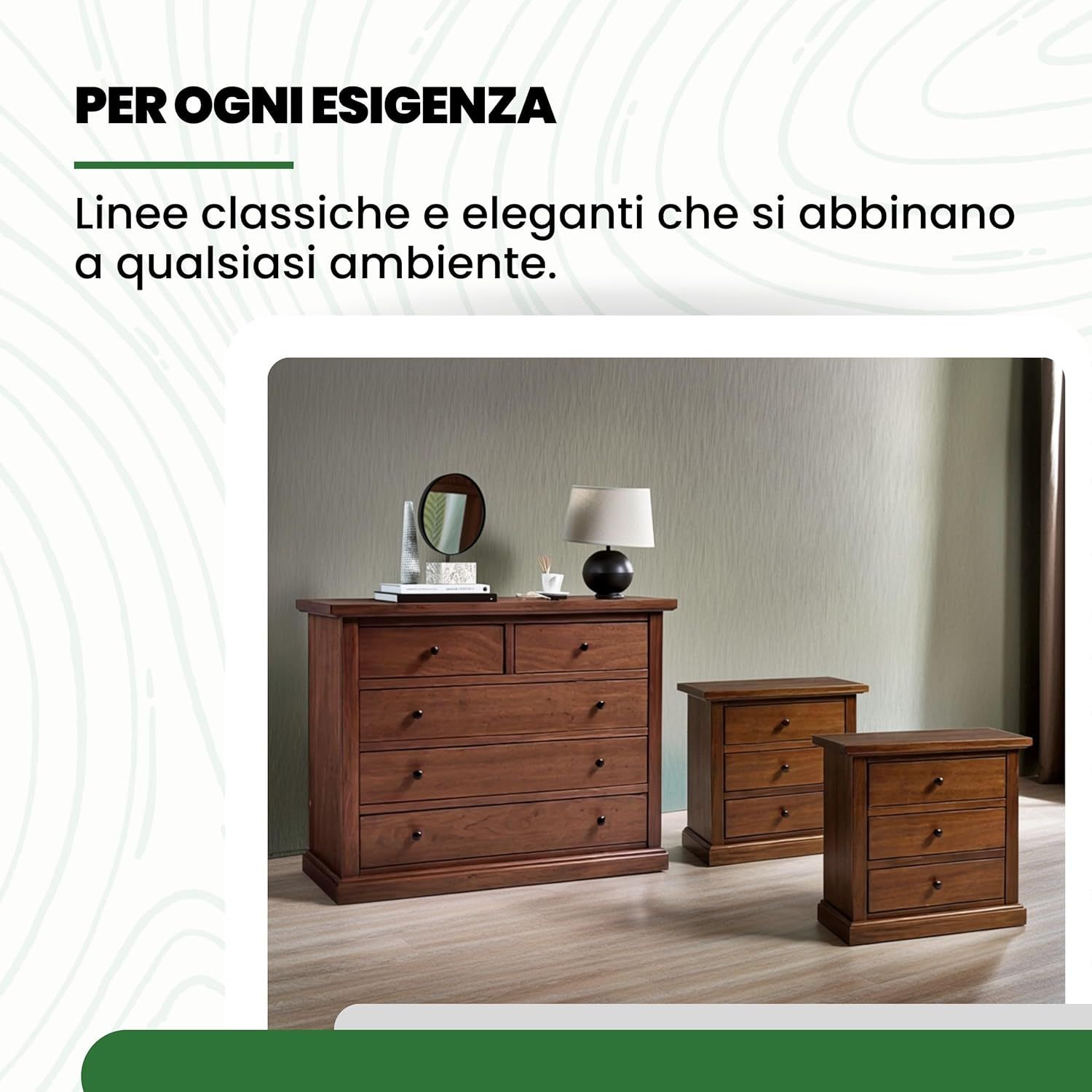 DESCRIZIONE : Gruppo comò e 2 comodini. Sia il comò che i comodini sono dotati zoccolo a terra e cassetti in luce