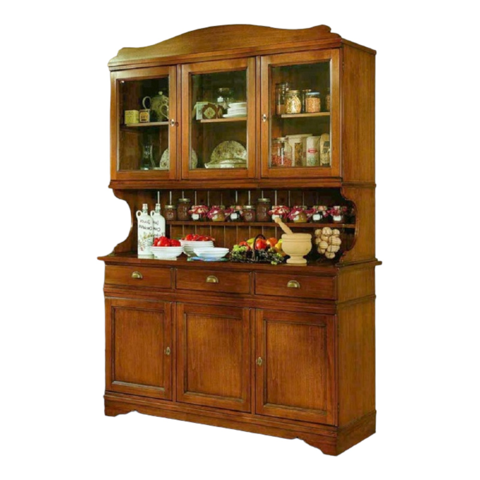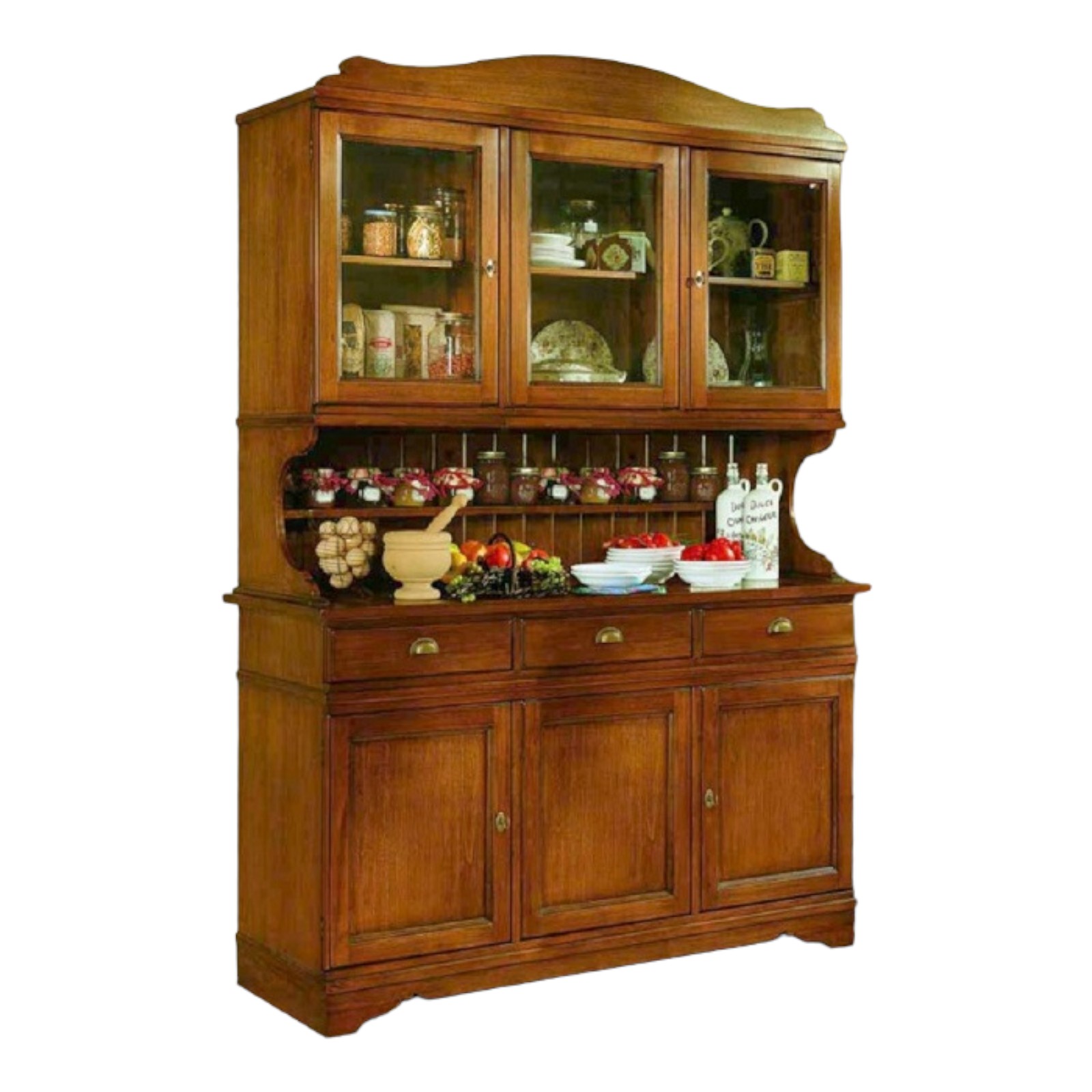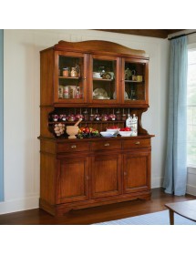 Cristalliera con 6 ante battenti e 3 cassetti , all' interno un ripiano sulla base e un ripiano sull' alzata .