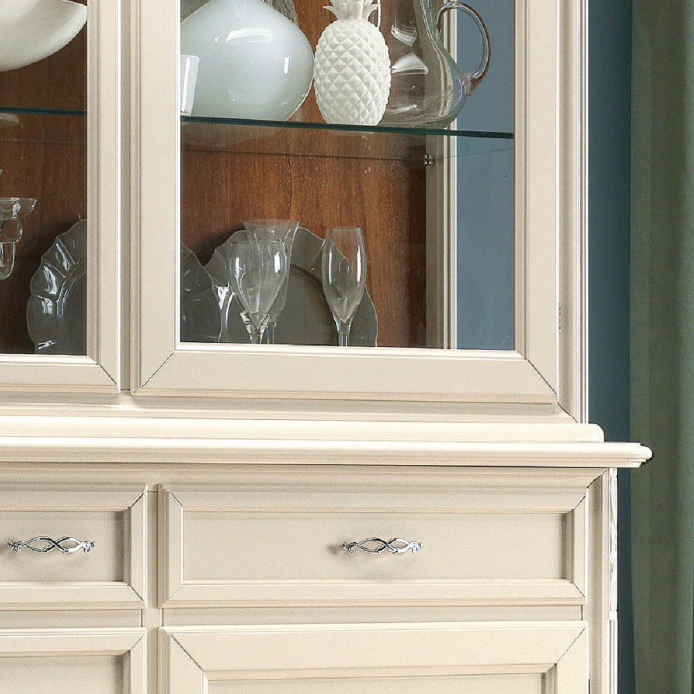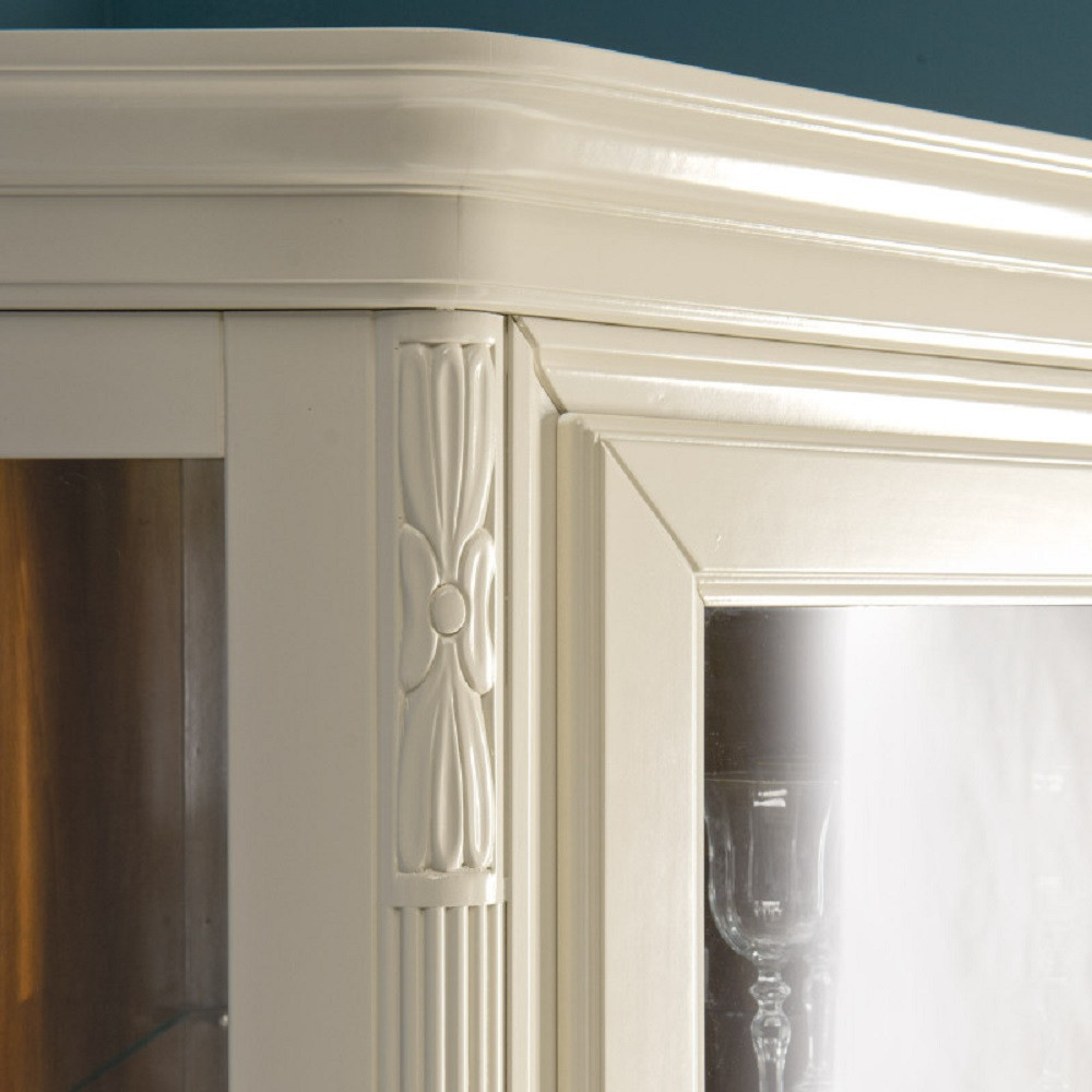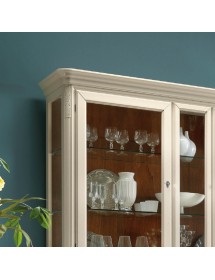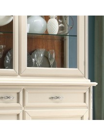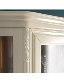 La cristalliera è formata da un unico vano ed ha fianchi e ante con vetro liscio ed è caratterizzata da piccoli elementi intagliati e da profili decorativi. La base invece è divisa in due vani con ripiani interni ed è dotata di due ante quadrate con profilo in legno. Sopra le ante sono presenti cassetti con frontale incorniciato. Spalle leggermente intagliate.