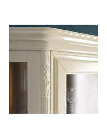 La cristalliera è formata da un unico vano ed ha fianchi e ante con vetro liscio ed è caratterizzata da piccoli elementi intagliati e da profili decorativi. La base invece è divisa in due vani con ripiani interni ed è dotata di due ante quadrate con profilo in legno. Sopra le ante sono presenti cassetti con frontale incorniciato. Spalle leggermente intagliate.