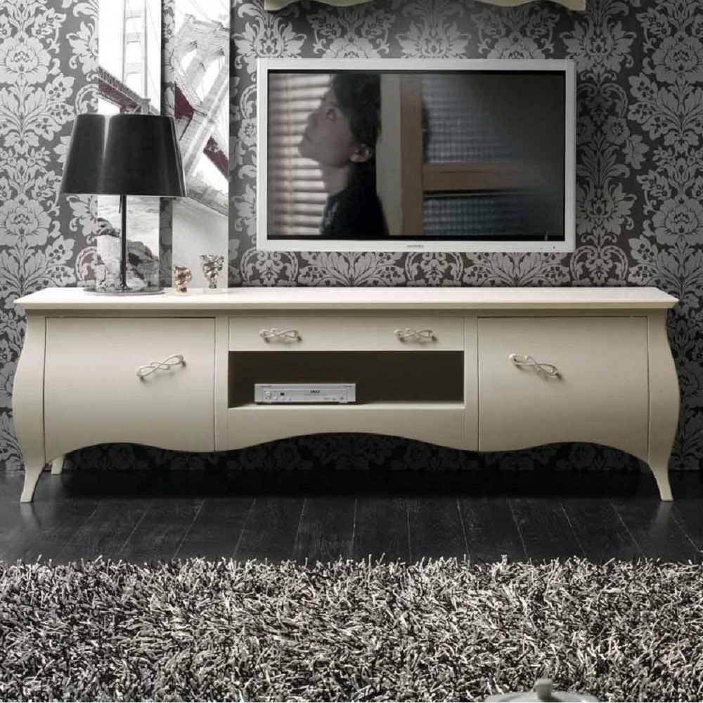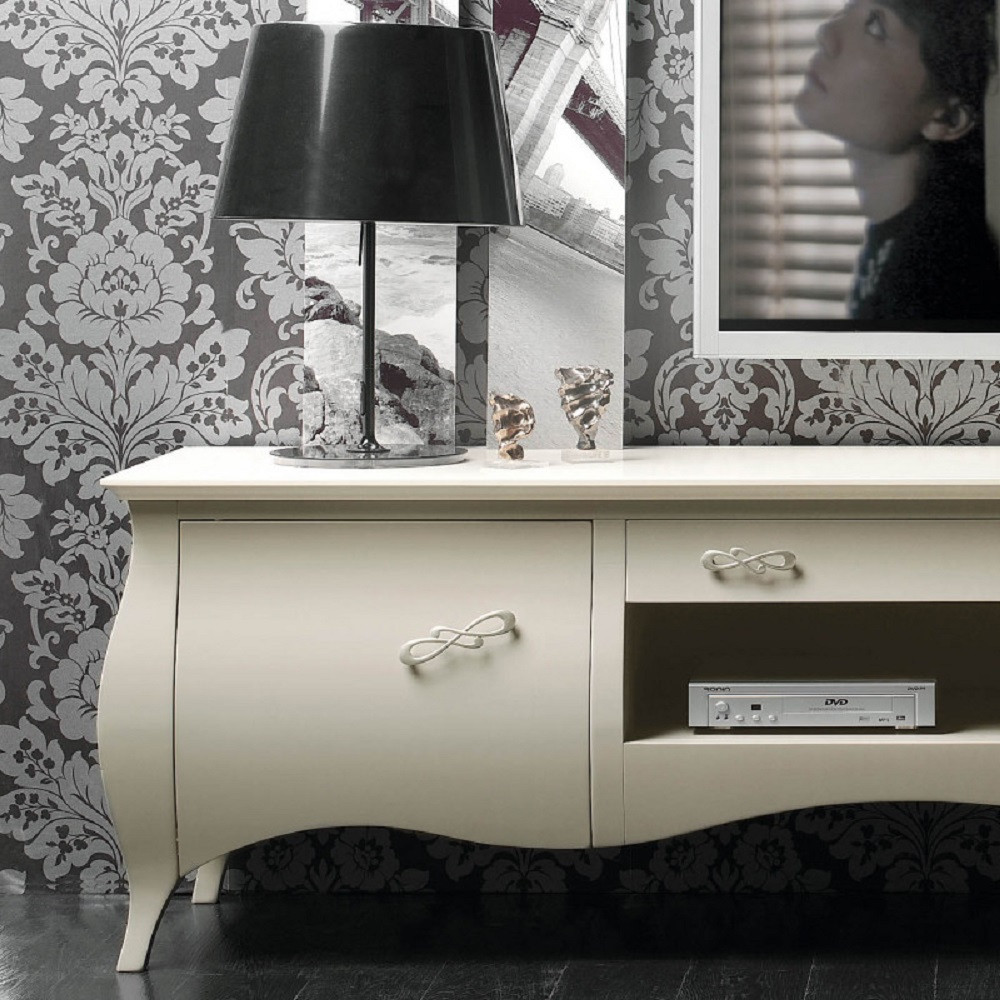 Mobile base porta TV dalla forma bombata, dotato di due antine senza ripiani interni ed un cassetto. Sotto al cassetto è presente un vano a giorno, perfetto per l’inserimento di decoder o lettori dvd. La forma bombata priva di ulteriori ornamenti permette di inserire questo porta TV sia in ambienti classici che in ambienti moderni, eventualmente alleggerendone l’immagine con un colore laccato.