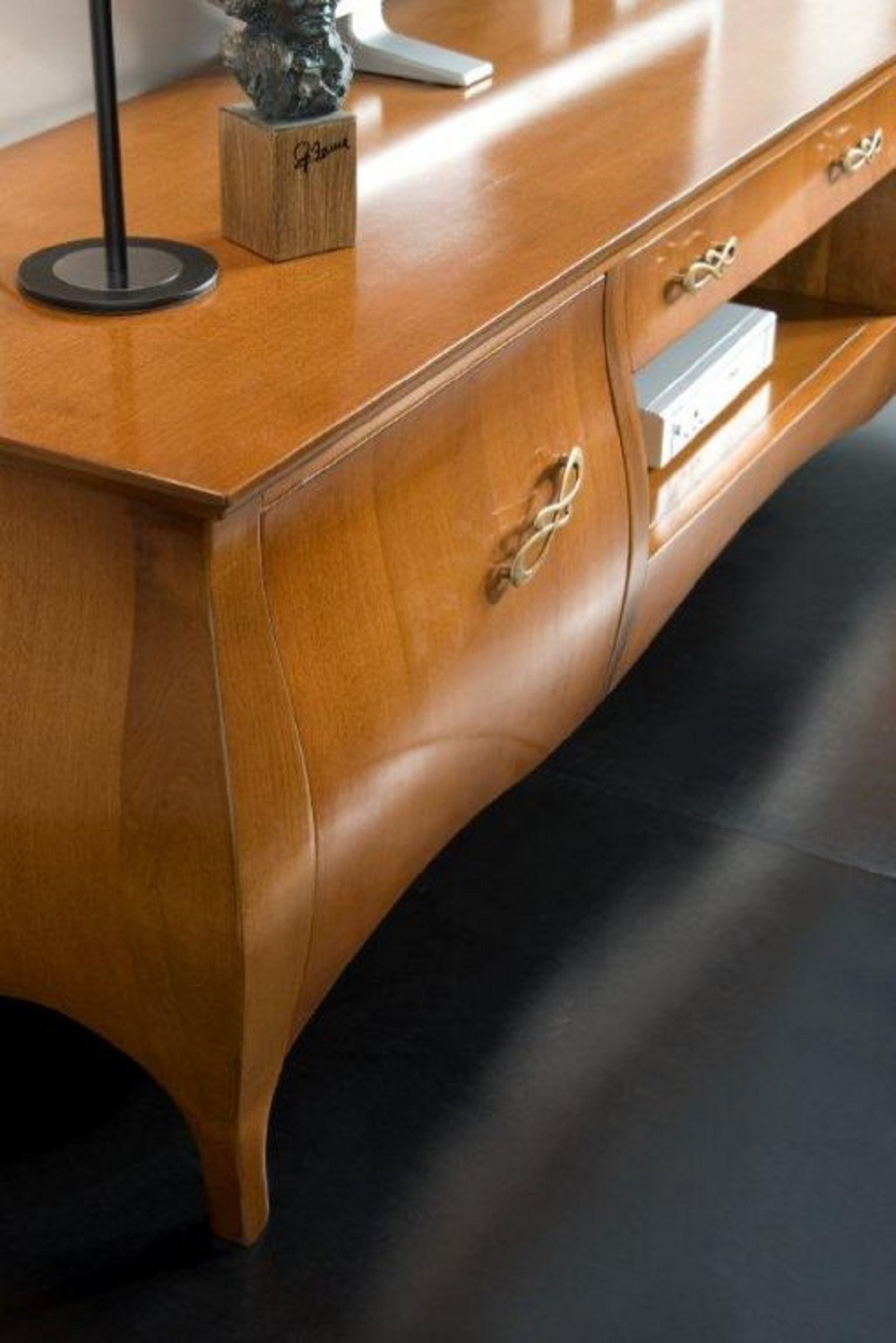 Mobile base porta TV dalla forma bombata, dotato di due antine senza ripiani interni ed un cassetto. Sotto al cassetto è presente un vano a giorno, perfetto per l’inserimento di decoder o lettori dvd. La forma bombata priva di ulteriori ornamenti permette di inserire questo porta TV sia in ambienti classici che in ambienti moderni, eventualmente alleggerendone l’immagine con un colore laccato.