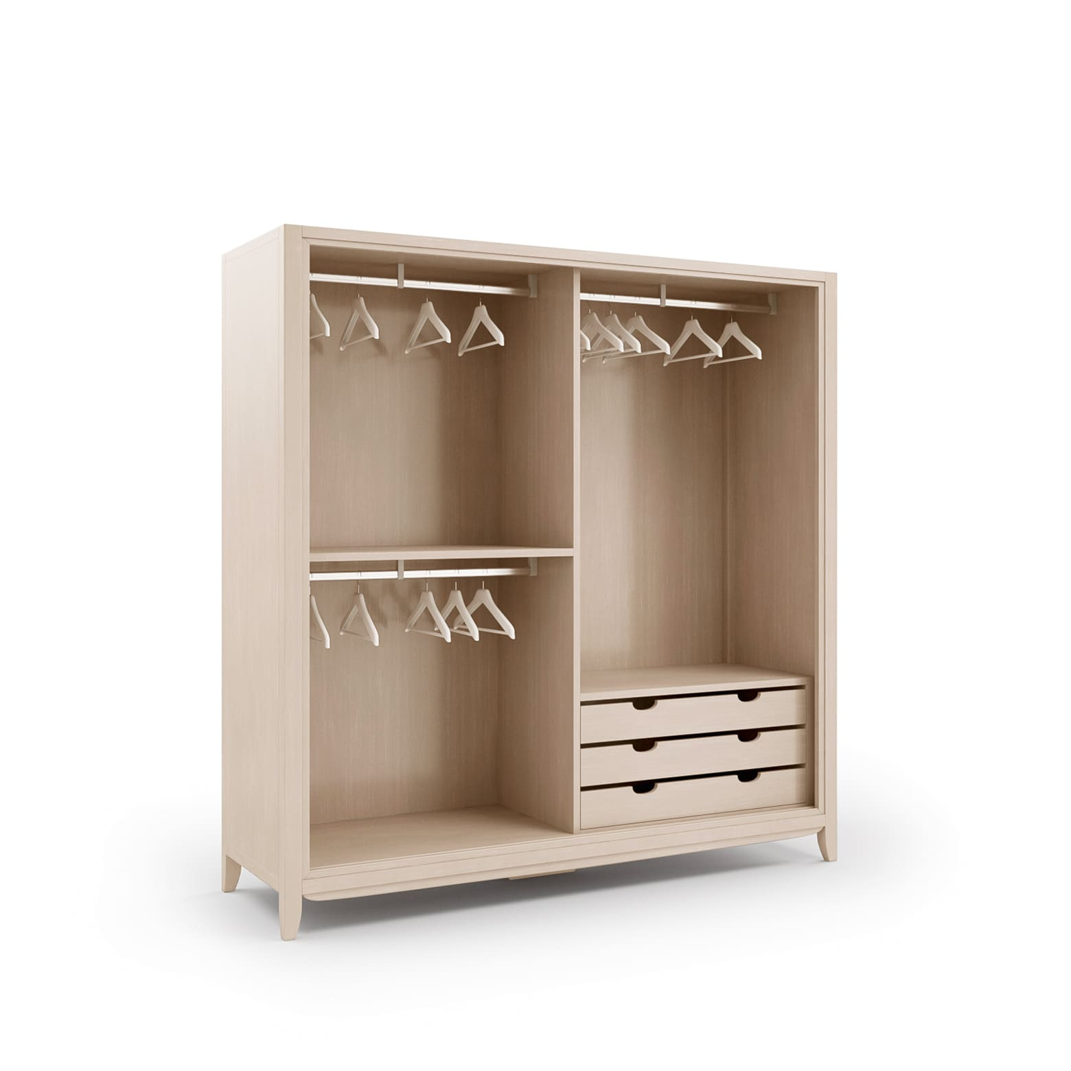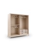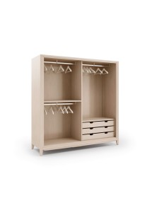 La dotazione interna comprende una cassettiera con tre cassetti ammortizzati, un ripiano di copertura, un ripiano superiore e tre bastoni appendiabiti, che ti aiuteranno ad organizzare con ordine e semplicità giacche, abiti, camicie, biancheria e accessori.