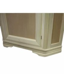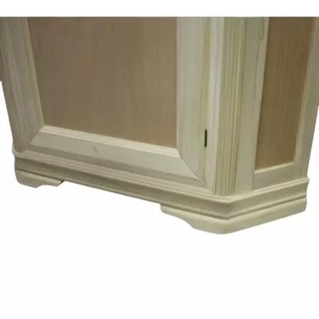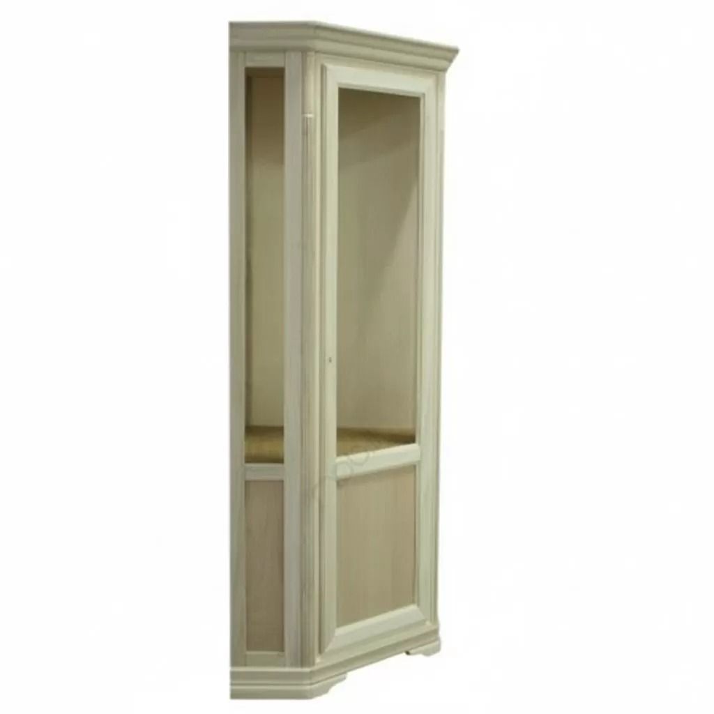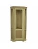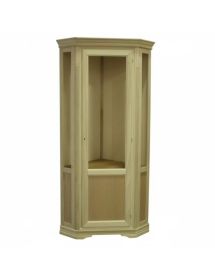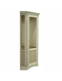 Vetrina ad angolo di gusto shabby. Dotata di un’anta a vetro liscio, è caratterizzata da piccoli elementi intagliati e da profili molto decorativi. Spalle leggermente intagliate. Tre ripiani in vetro nella parte a vista con una tramezza fissa e un ripiano nella parte chiusa.