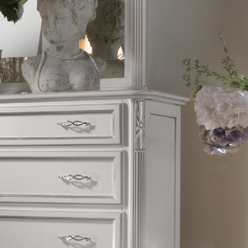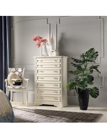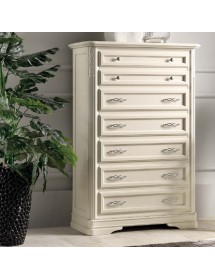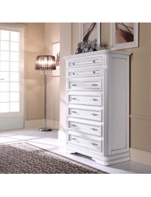 Cassettiera settimanale con sette cassetti di gusto classico , dotata di piccoli elementi intagliati e da profili molto decorativi. Cassetti con frontale incorniciato con altezza differenziata tra i primi due e i cinque inferiori. Spalle leggermente intagliate, fianchi incorniciati, zoccolo sorretto da mensole sagomate laterali.