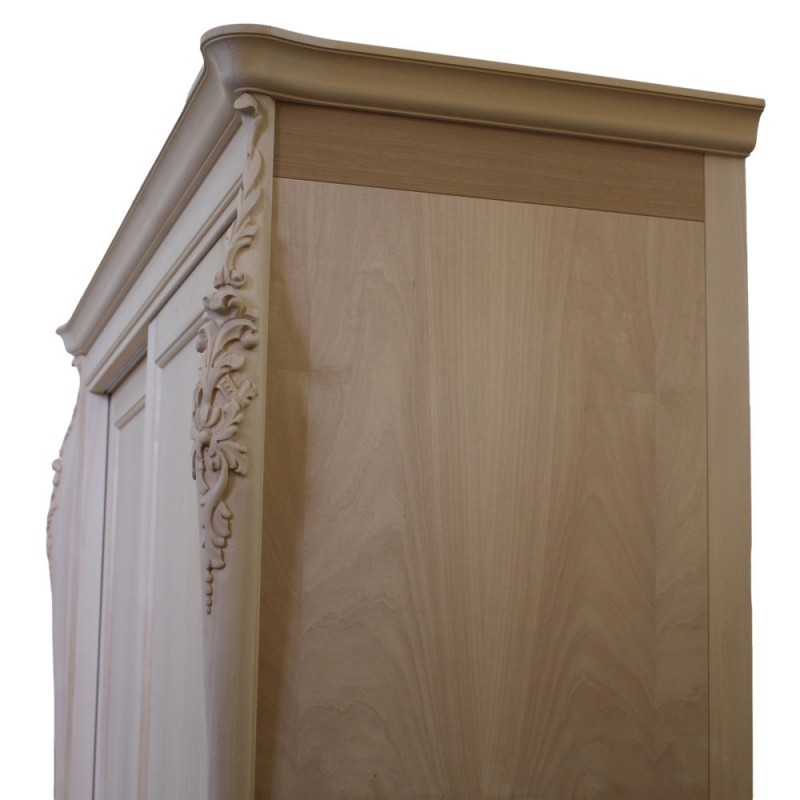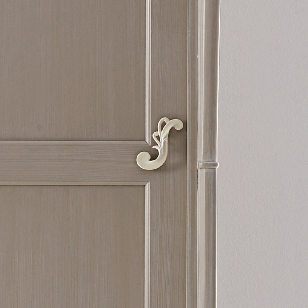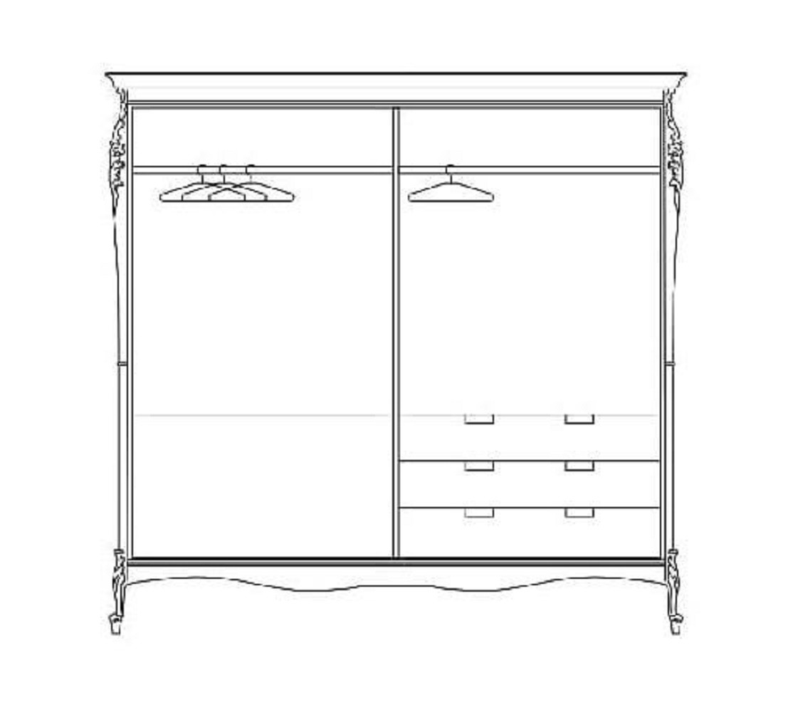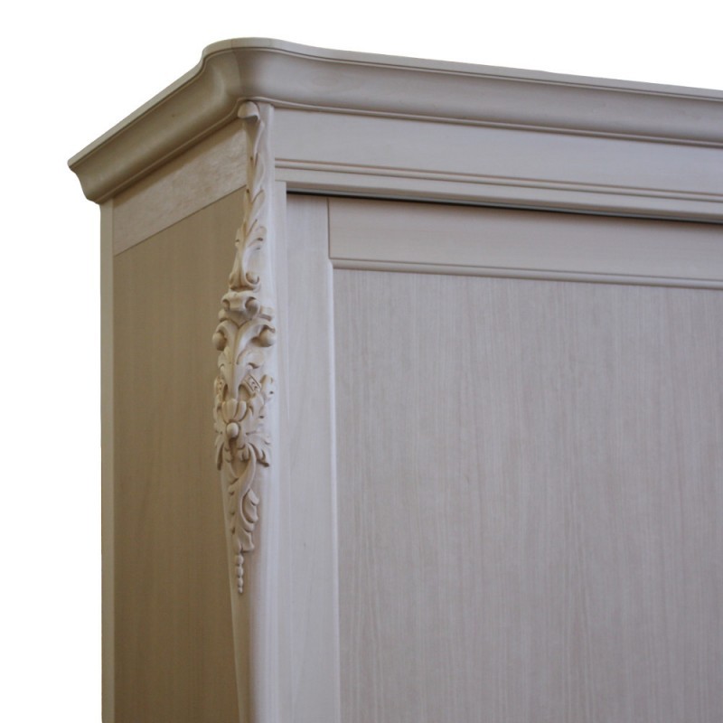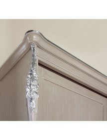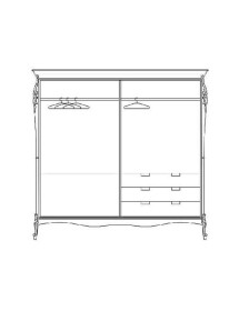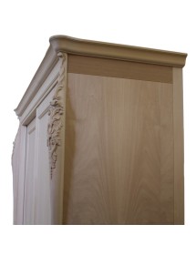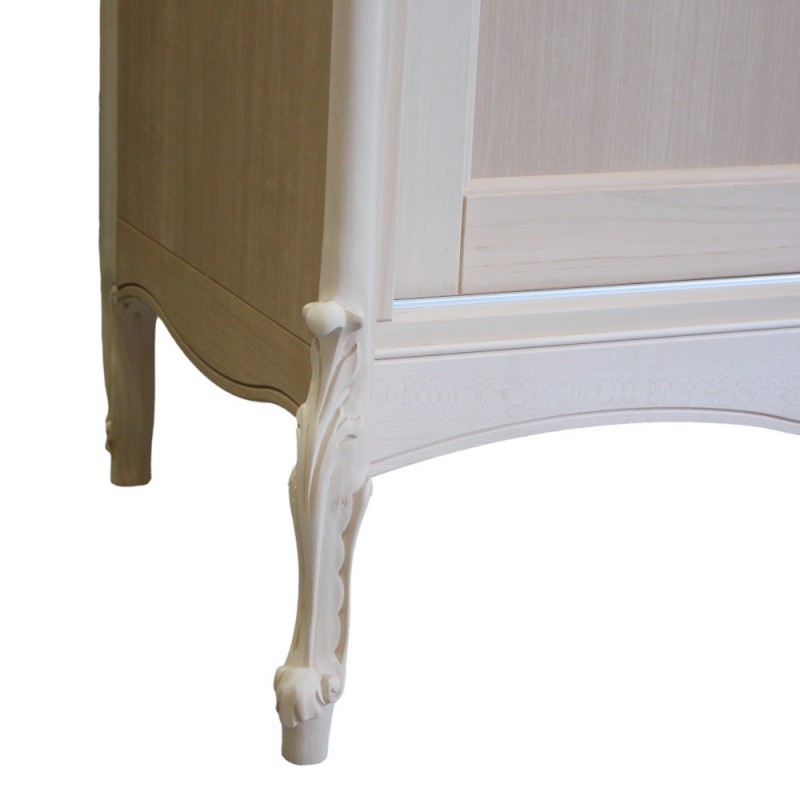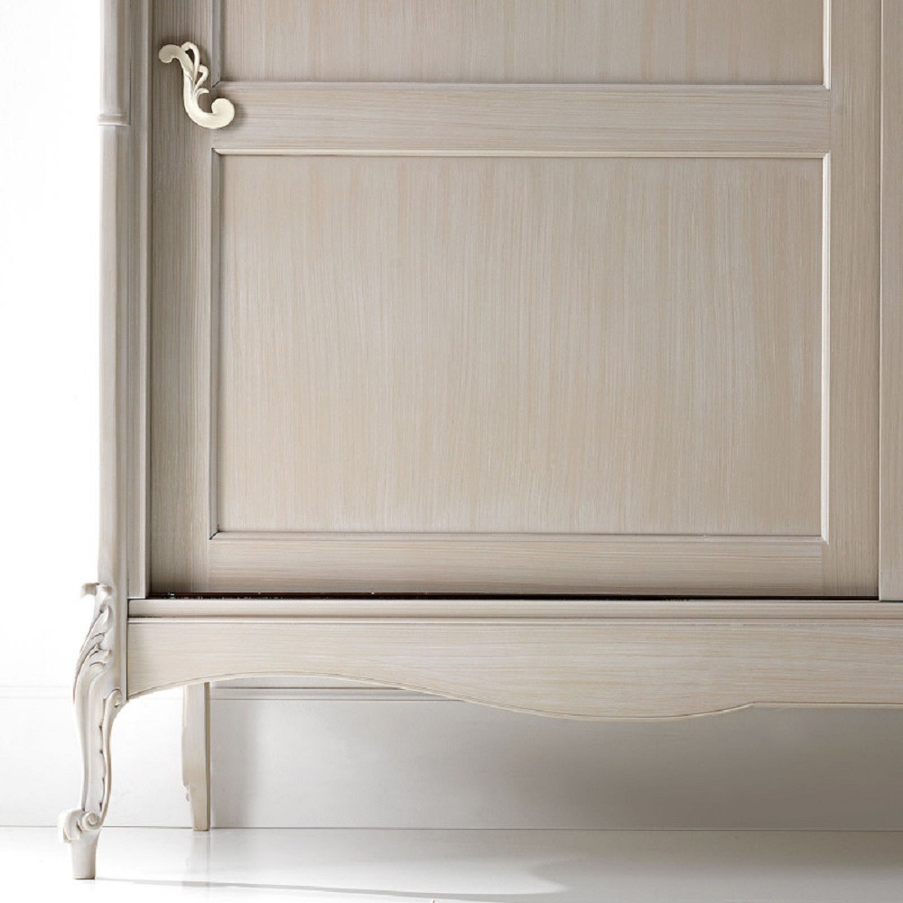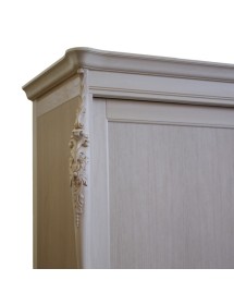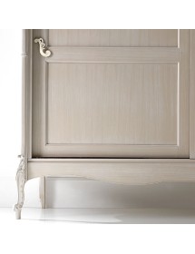 Elegante e raffinato armadietto con due ante scorrevoli, destinato ad una casa esclusiva e di classe. Spalle sagomate con evidenti intagli nella parte superiore ed inferiore, top sagomato con cornice lungo il perimetro e base alzata da terra da piedini finemente lavorati. Le forme delicate ma importanti sono decorate da dettagli riccamente intagliati. Questo armadio può essere inserito all’interno di un arredamento classico, sia come elemento singolo oppure in abbinamento alla camera da letto della stessa collezione.