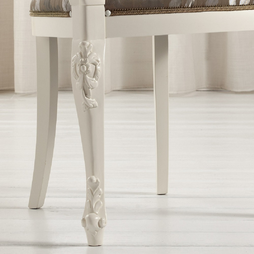 Elegante e raffinato capotavola con sedile e schienale imbottito, lo schienale presenta una lavorazione a 5 bottoni. Gambe anteriori intagliate. Questa capotavola è destinato ad una casa esclusiva e di classe. Le forme delicate ma importanti sono decorate da dettagli riccamente intagliati.