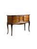 Elegante consolle a muro composta da una piccola anta centrale riquadrata e quattro cassetti laterali. Piano sagomato leggermente sporgente dal corpo del mobile, spalle anteriori arrotondate, fianchi lisci. Gambe a sciabola che terminano in una fascia elegantemente sagomata. Il basamento è arricchito da una cornice che richiama la linea del piano