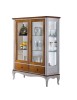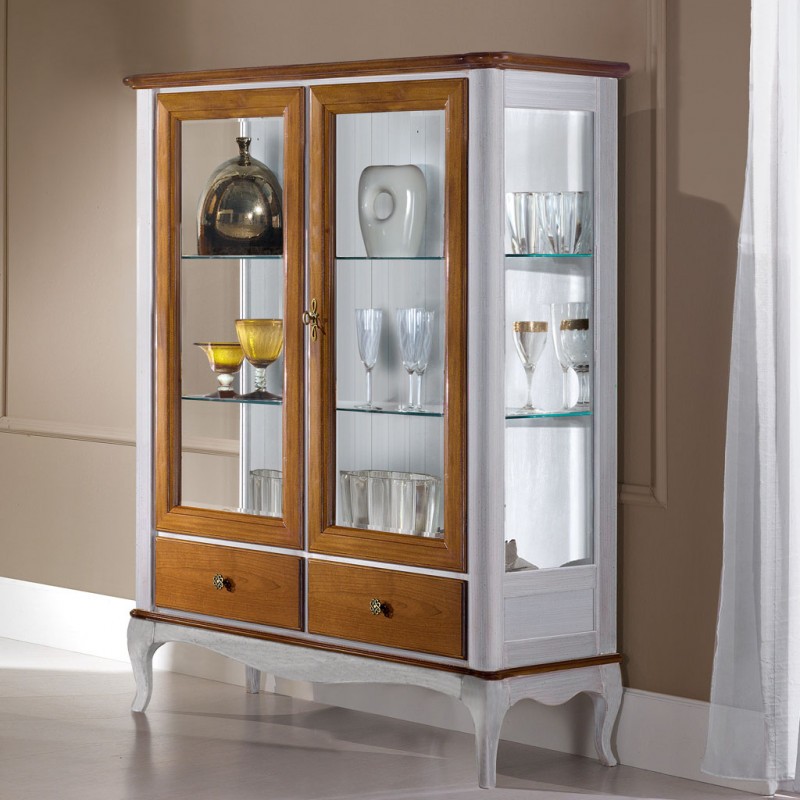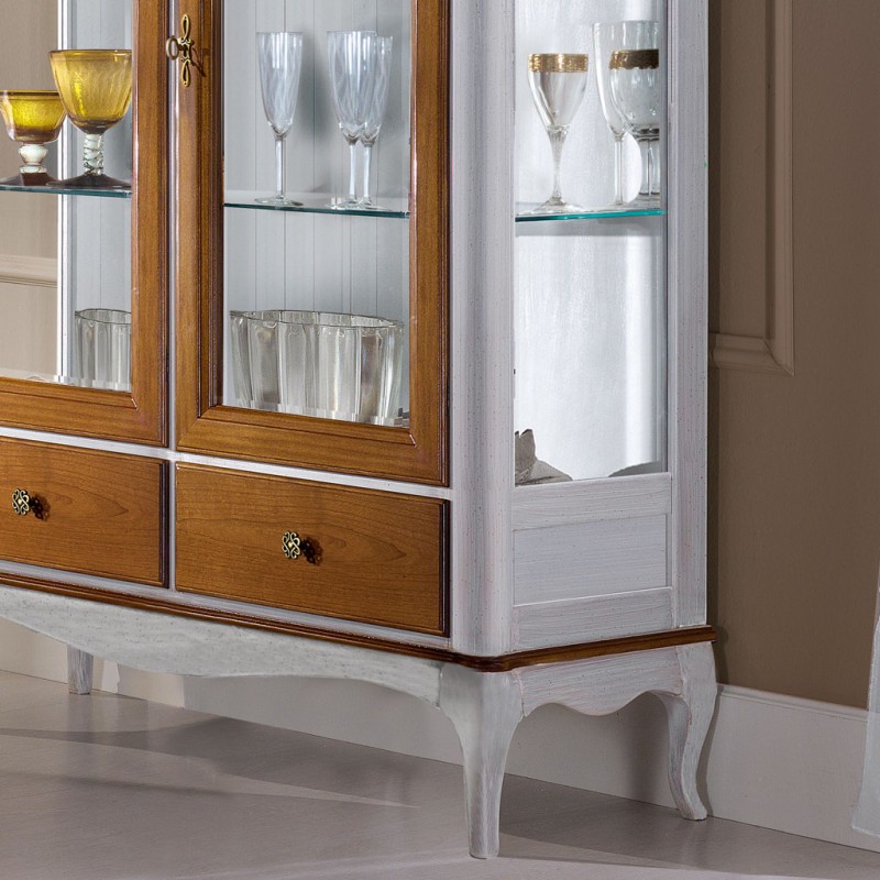 Elegante vetrina a due ante a vetro con due cassetti nella parte inferiore. Top con cornice sagomato leggermente sporgente dal corpo del mobile, spalle anteriori arrotondate, fianchi a vetro. Le ante presentano una chiusura a serratura, all’interno si trovano due ripiani in vetro. Schienale dogato. Il basamento è arricchito da una cornice che richiama la linea del piano. Gambette a sciabola che terminano su una fascia elegantemente sagomata.