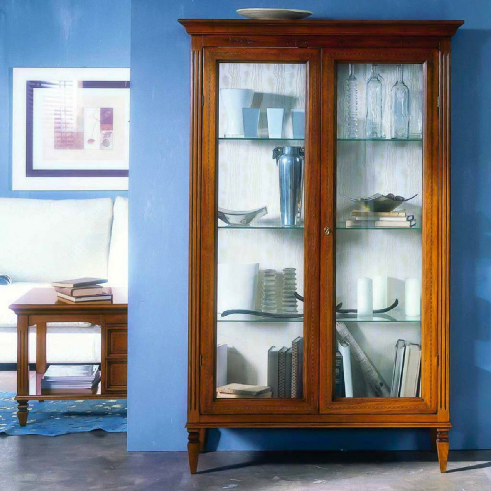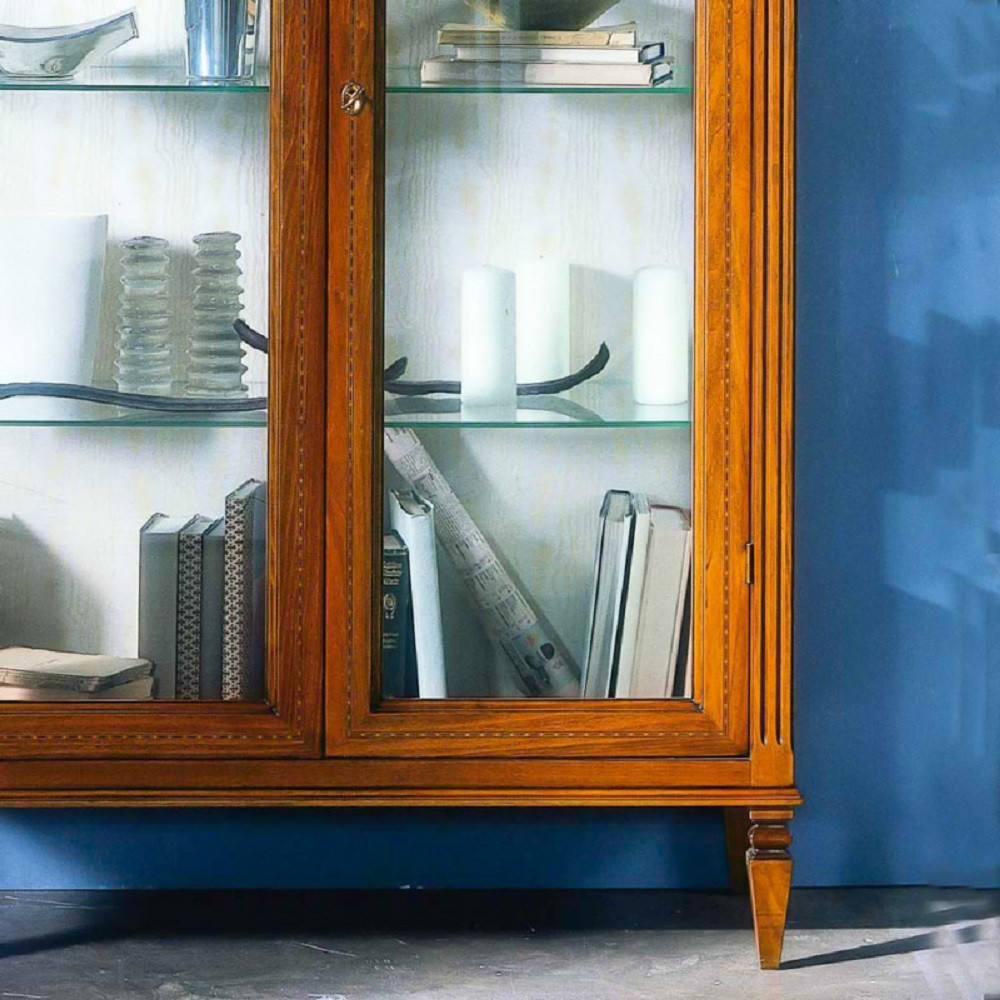 Vetrina classica in legno con due ante e fianchi in vetro trasparente, cappello sporgente dal perimetro del mobile con la fascia inferiore incisa a motivi floreali. Montanti delle spalle con unghiate, piedi a spillo. Ante e frontali dei cassetti arricchiti da filettature intarsiate.