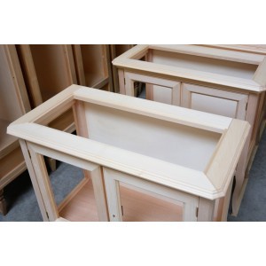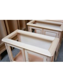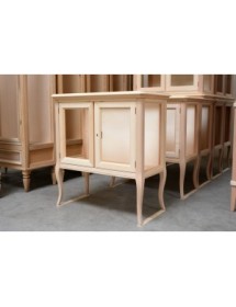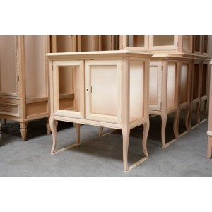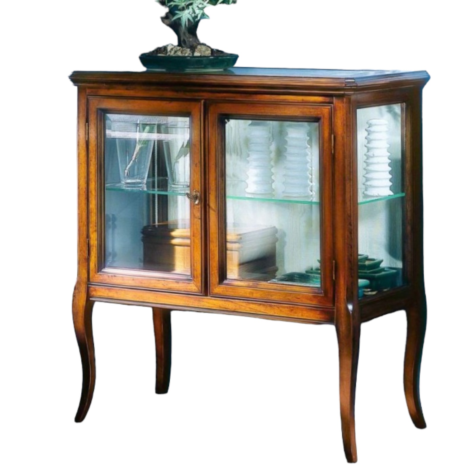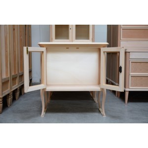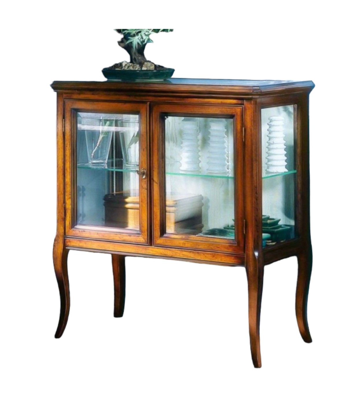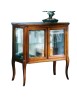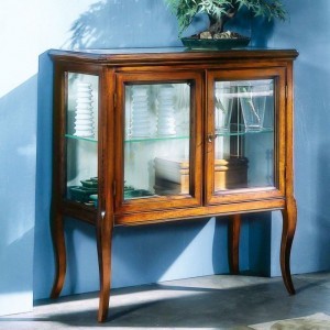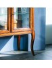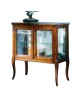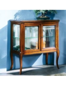 Vetrinetta classica in legno con ante e fianchi in vetro trasparente, piano sporgente dal perimetro del mobile con cornice inferiore intagliata. Montanti delle spalle arrotondati che proseguono con gambe sagomate.