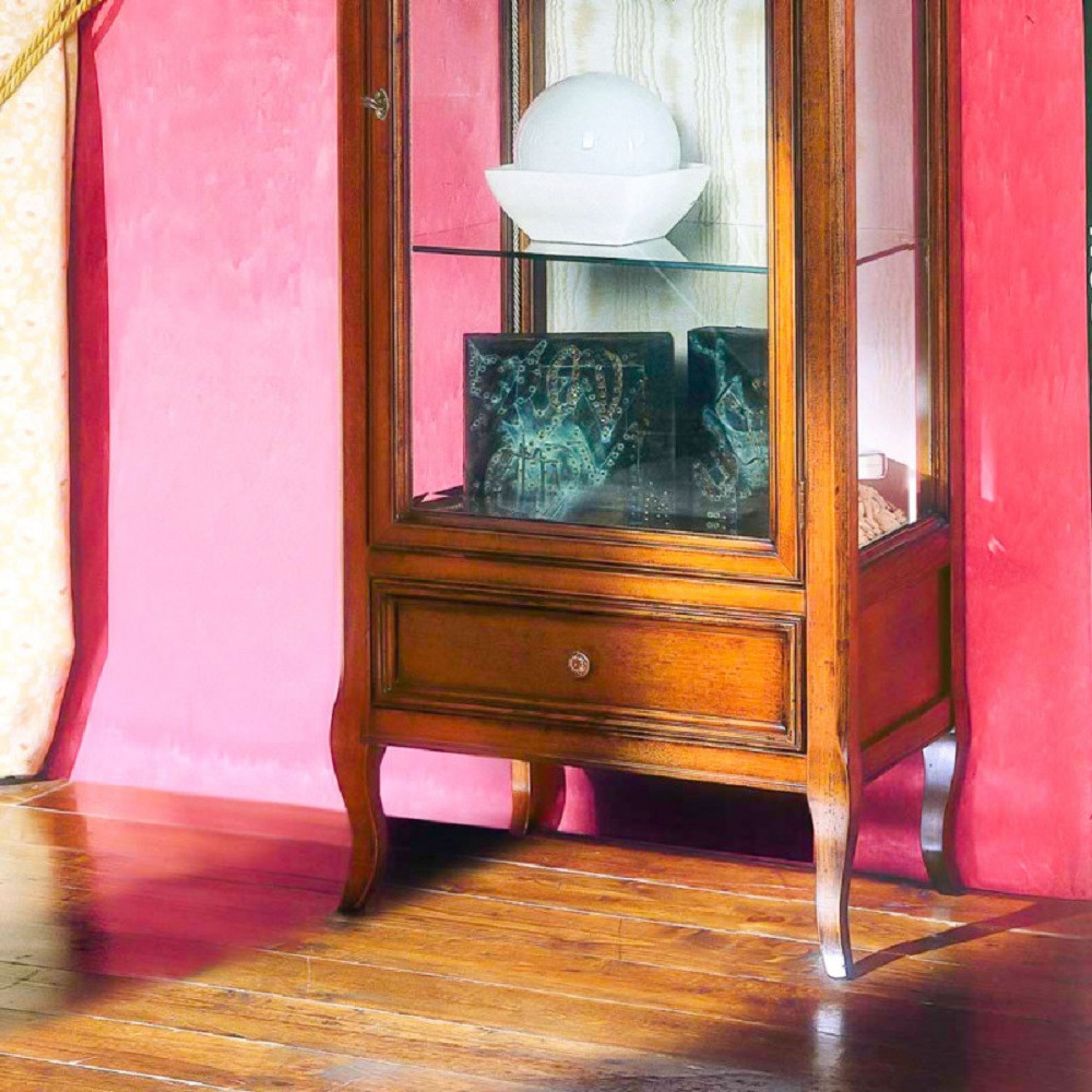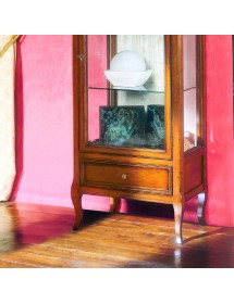 Vetrinetta classica in legno con ante e fianchi in vetro trasparente e liscio, piano sporgente dal perimetro del mobile. Montanti delle spalle arrotondati su gambe sagomate. Frontale del cassetto e fianchi riquadrati con una cornice sagomata.