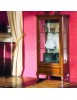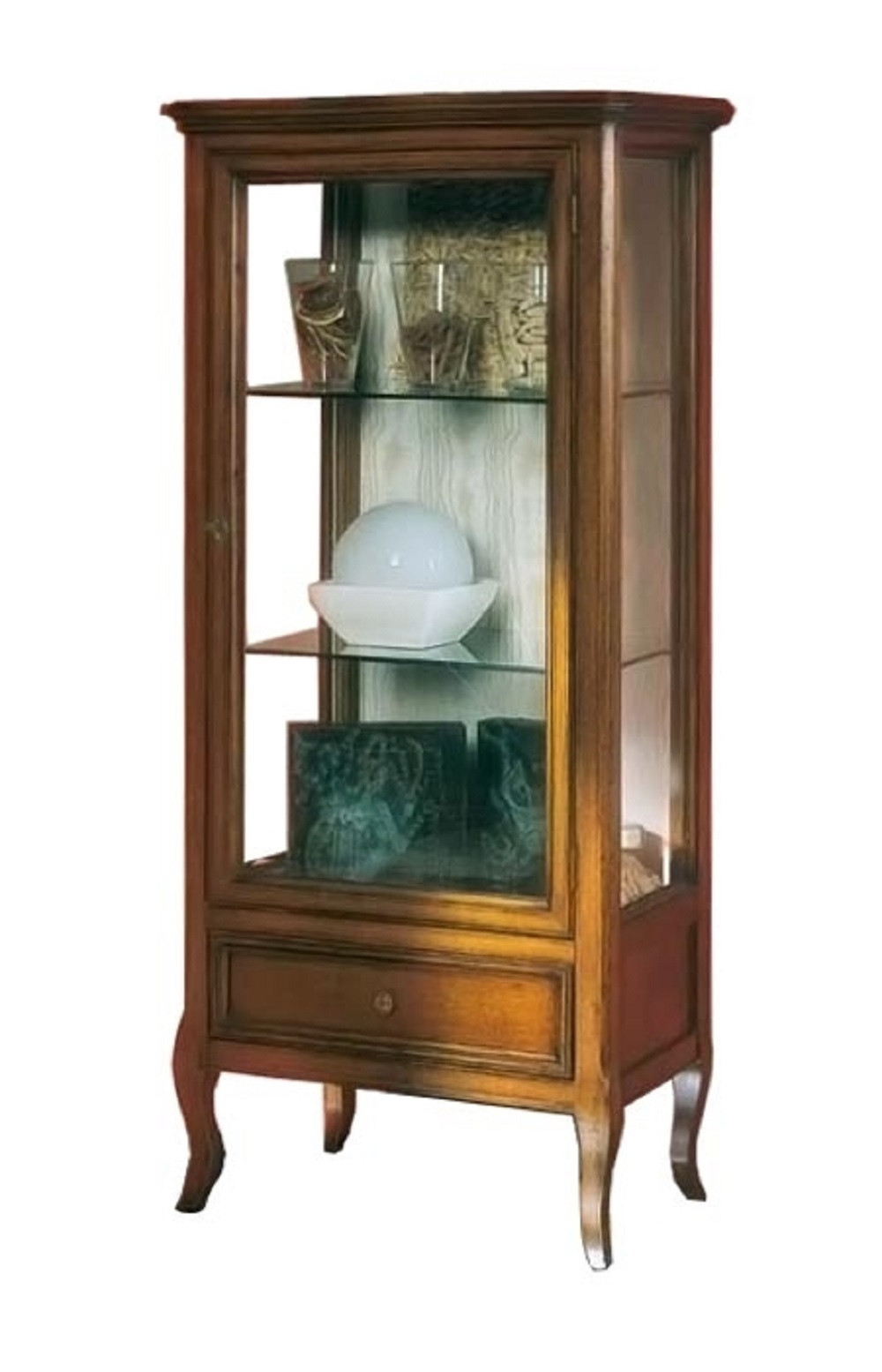 Vetrinetta classica in legno con ante e fianchi in vetro trasparente e liscio, piano sporgente dal perimetro del mobile. Montanti delle spalle arrotondati su gambe sagomate. Frontale del cassetto e fianchi riquadrati con una cornice sagomata.