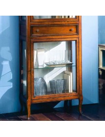 Vetrina classica in legno con ante e fianchi in vetro trasparente , frontale del cassetto e fianchi riquadrati con una cornice sagomata. Montanti delle spalle arrotondati che proseguono con delle gambe sagomate.