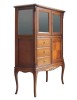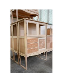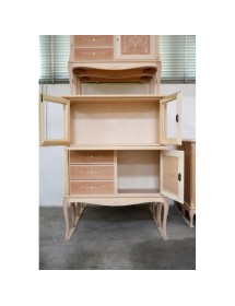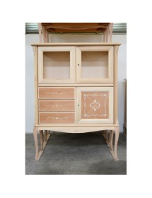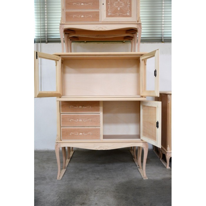 Mobile bar Vetrina a 3 ante e 3 cassetti elegante e raffinata con i suoi intarsi e le forme arrotondate, arricchite da particolari intagliati nel legno massello e il piano che riprende negli angoli la bombatura della gamba, adatta per esporre i calici più importanti per poterli appoggiare nel comodo tiretto e fare un bel brindisi con gli amici ; chiusura con chiave e ripiani interni in vetro, schienale tappezzato in tessuto beige .