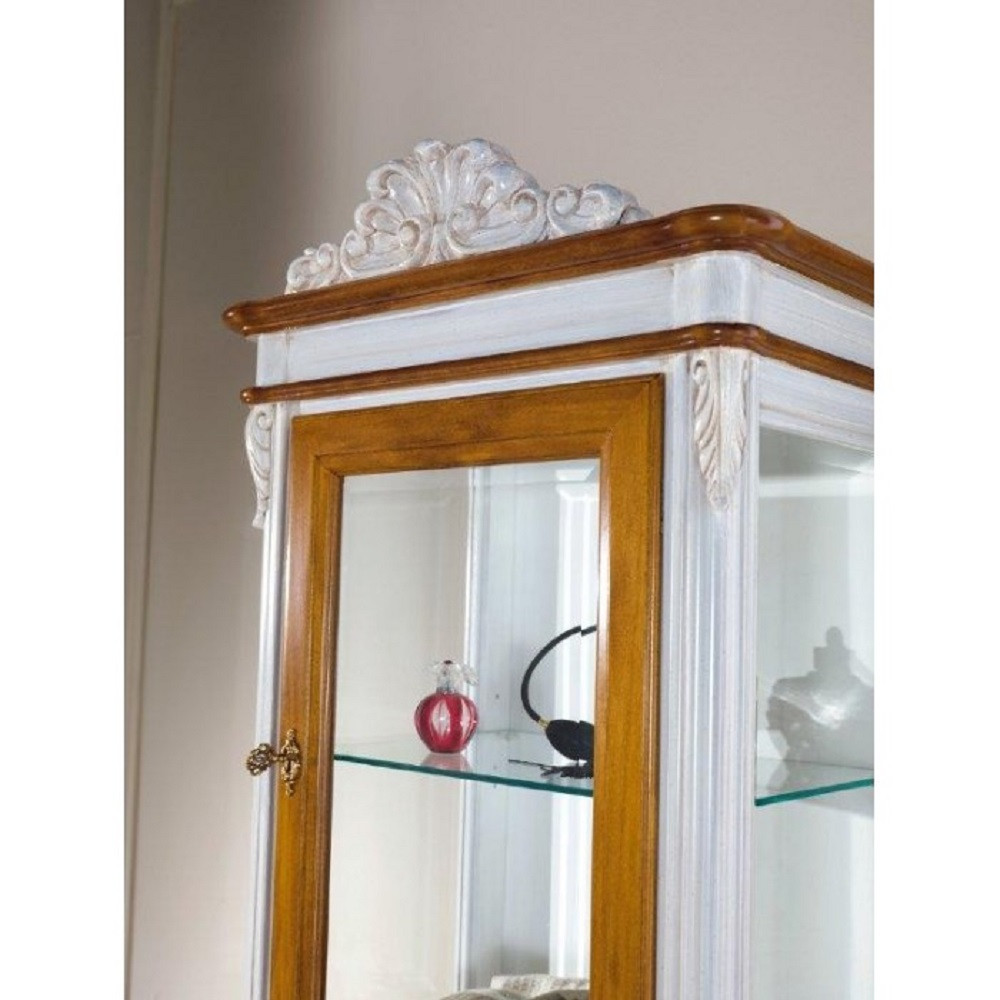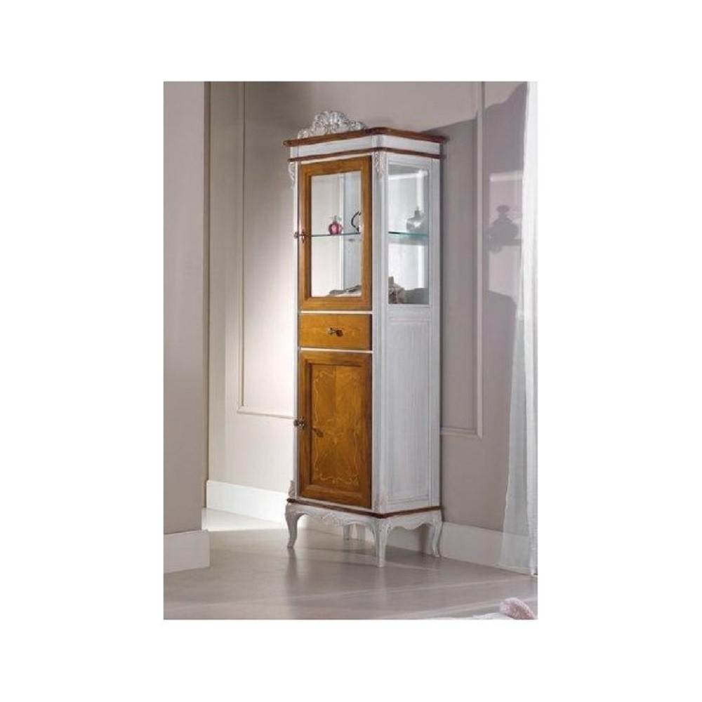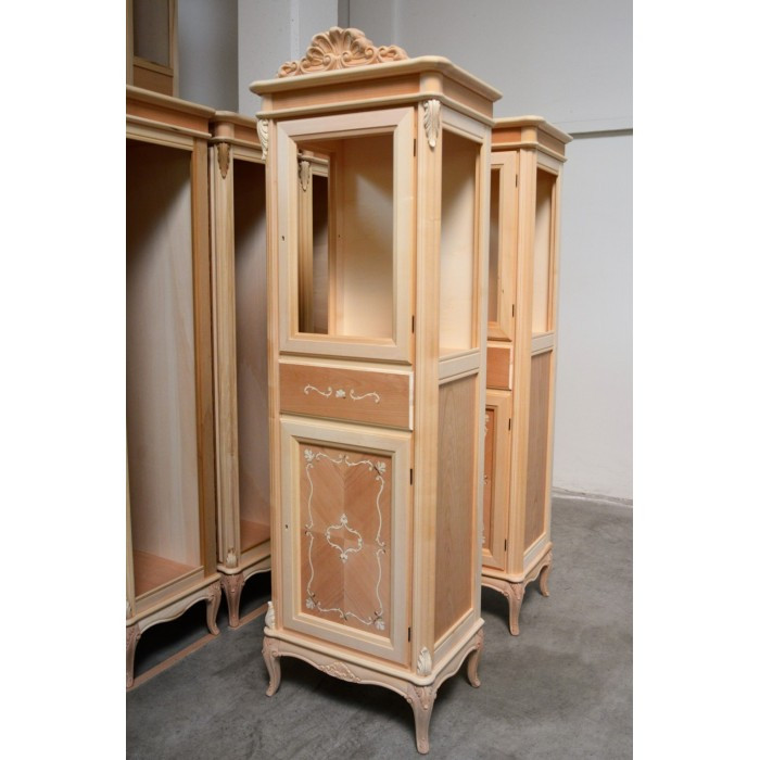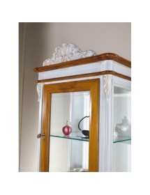 Elegante vetrina ad un’anta a vetro e un'anta legno con un cassetto nella parte centrale con particolari intagliati e intarsiati. Top con cornice sagomata leggermente sporgente dal corpo del mobile, spalle anteriori arrotondate, fianchi a vetro. Le ante presentano una chiusura a serratura, all’interno si trovano un ripiano in vetro. Il basamento è arricchito da una cornice che richiama la linea del piano. Gambette a sciabola che terminano su una fascia elegantemente sagomata.