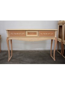 Consolle con tre cassetti. Gambe sagomate e arrotondate. Frontale del cassetto centrale riquadrato e 2 cassetti laterali con intarsi e foglie incise.