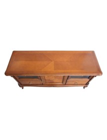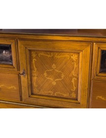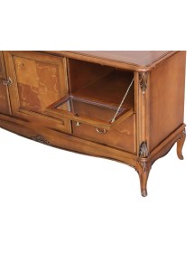 Elegante porta TV con un’anta, due cassetti e due vani con apertura a ribalta con intagli e intarsi. piano con cornice sagomato leggermente sporgente dal corpo del mobile, spalle arrotondate. L’anta centrale riquadrata presenta una chiusura a serratura, ai lati si trovano rispettivamente un cassetto nella parte inferiore, ed un vano con frontale a vetro trasparente e liscio e apertura a ribalta nella parte superiore. Il basamento è arricchito da una cornice che richiama la linea del piano. Gambette a sciabola che terminano su una fascia elegantemente sagomata.