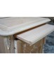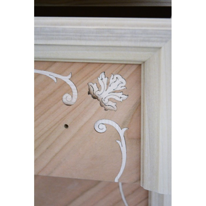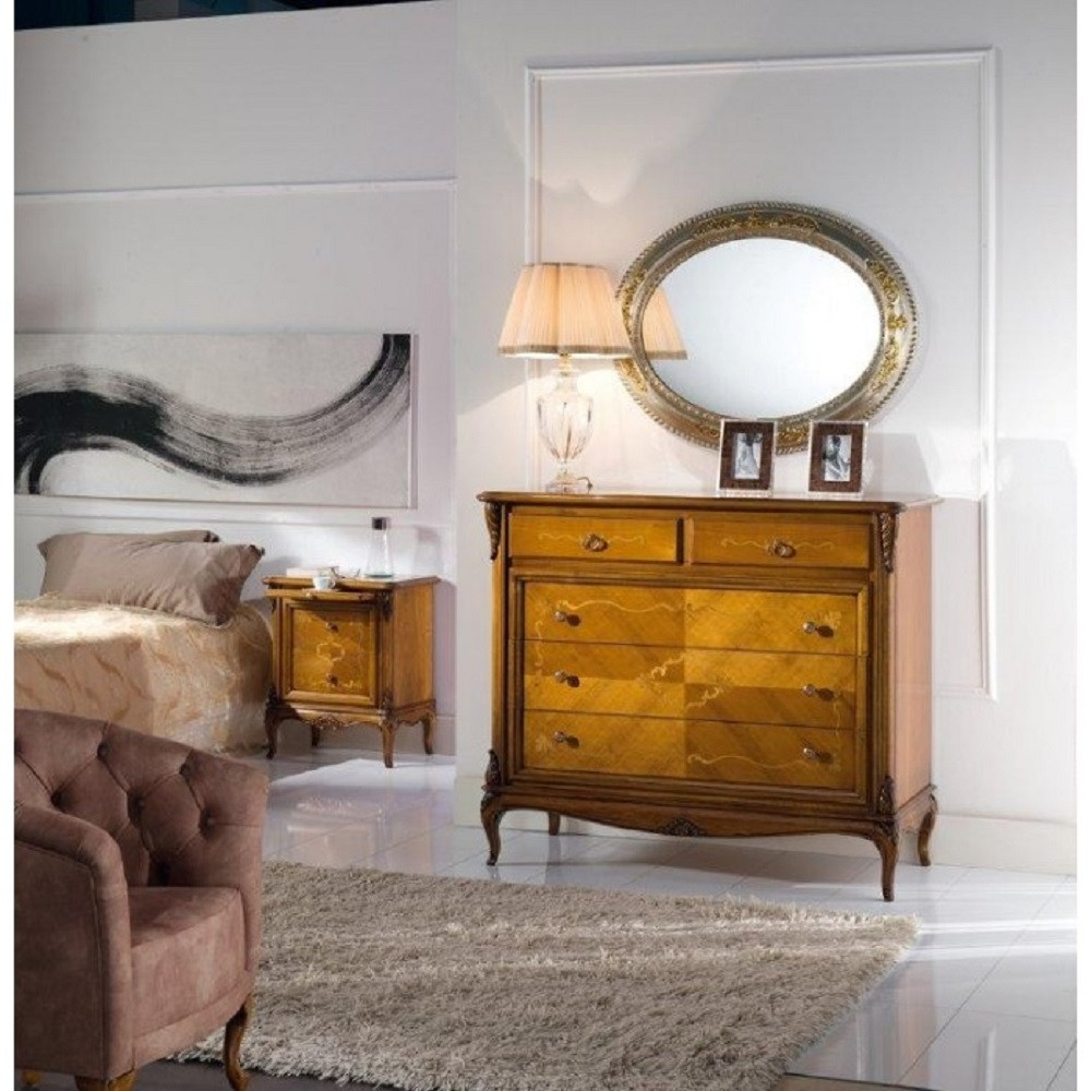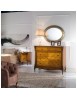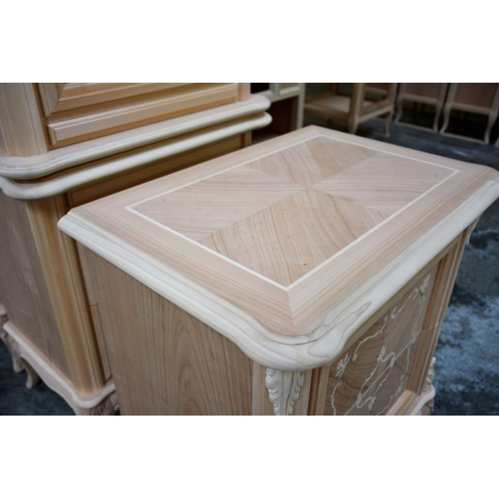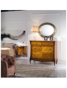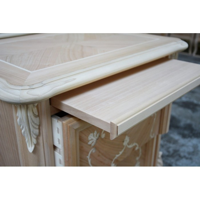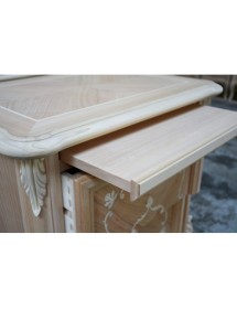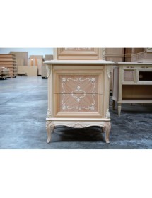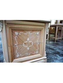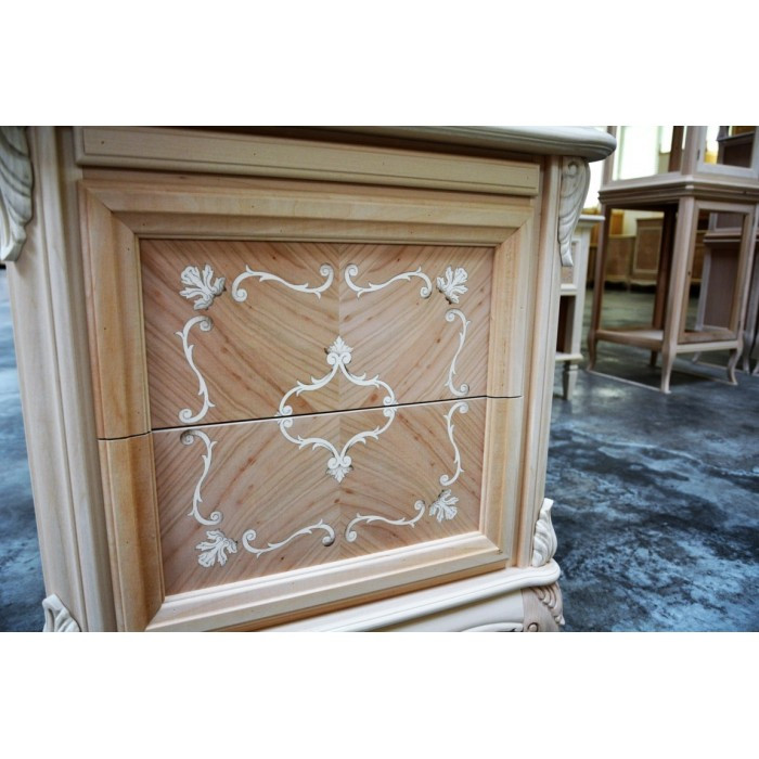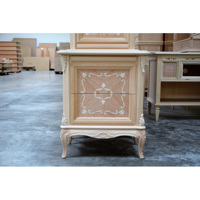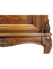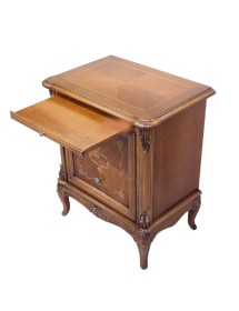 Comodino con due cassetti e tiretto sotto piano, elegante e raffinato con i suoi intarsi e le sue forme arrotondate, arricchite da particolari intagliati nel legno massello, il piano e gli angoli riprendono la bombatura della gamba .