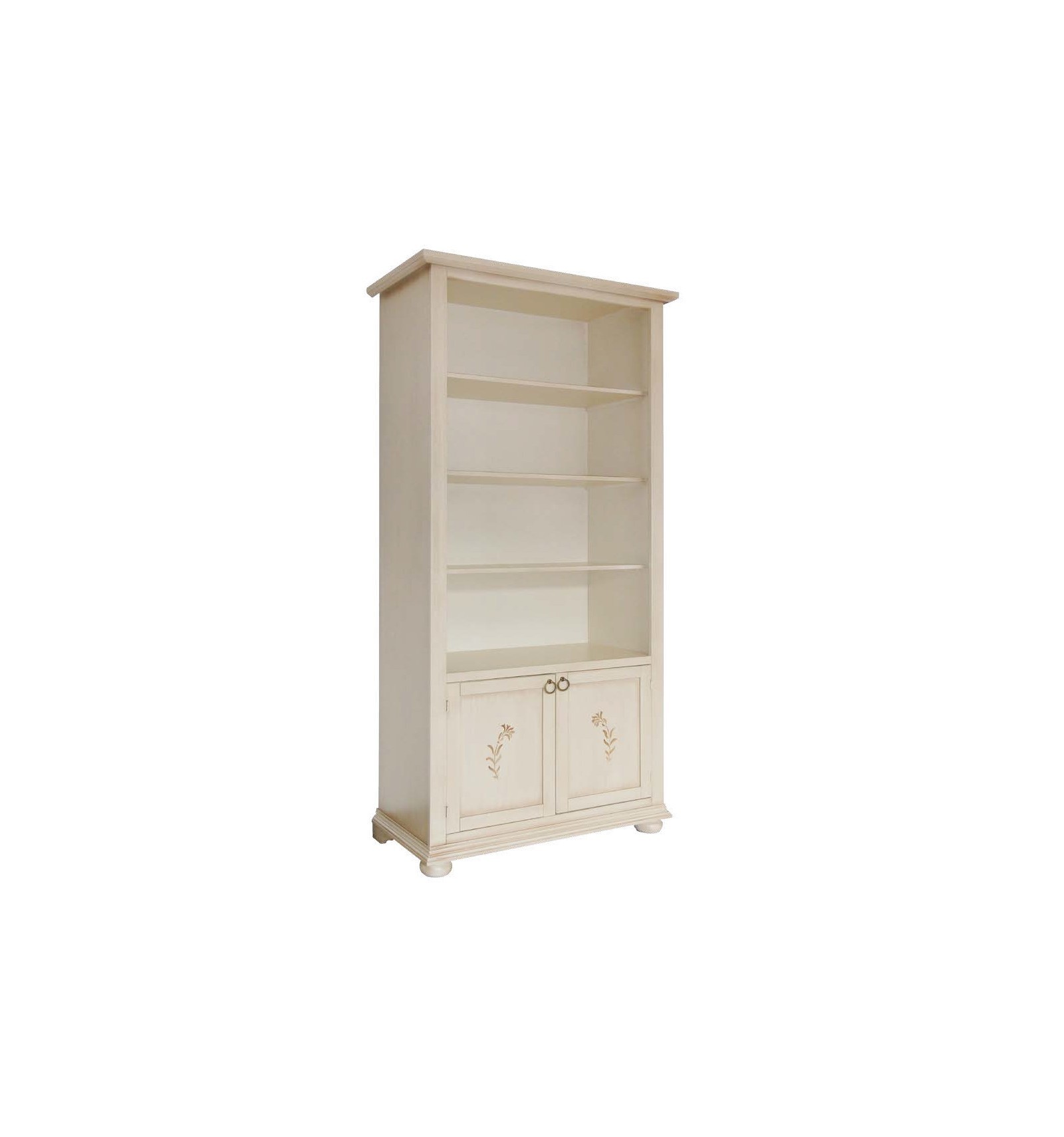 DESCRIZIONE : Libreria 3 ripiani a vista con 4 vani a giorno , 2 porte in legno con decori floreali , gambe frontali a cipolla .