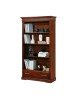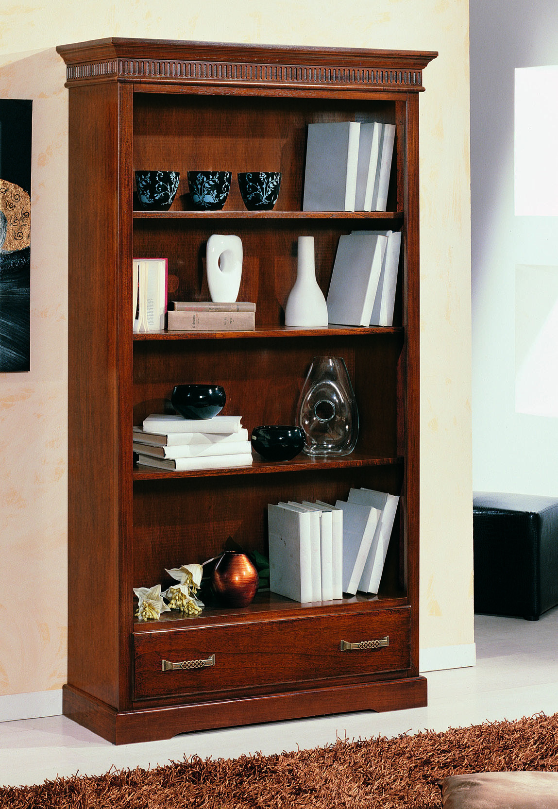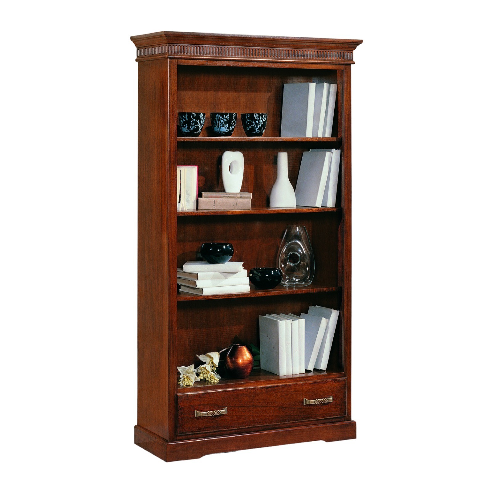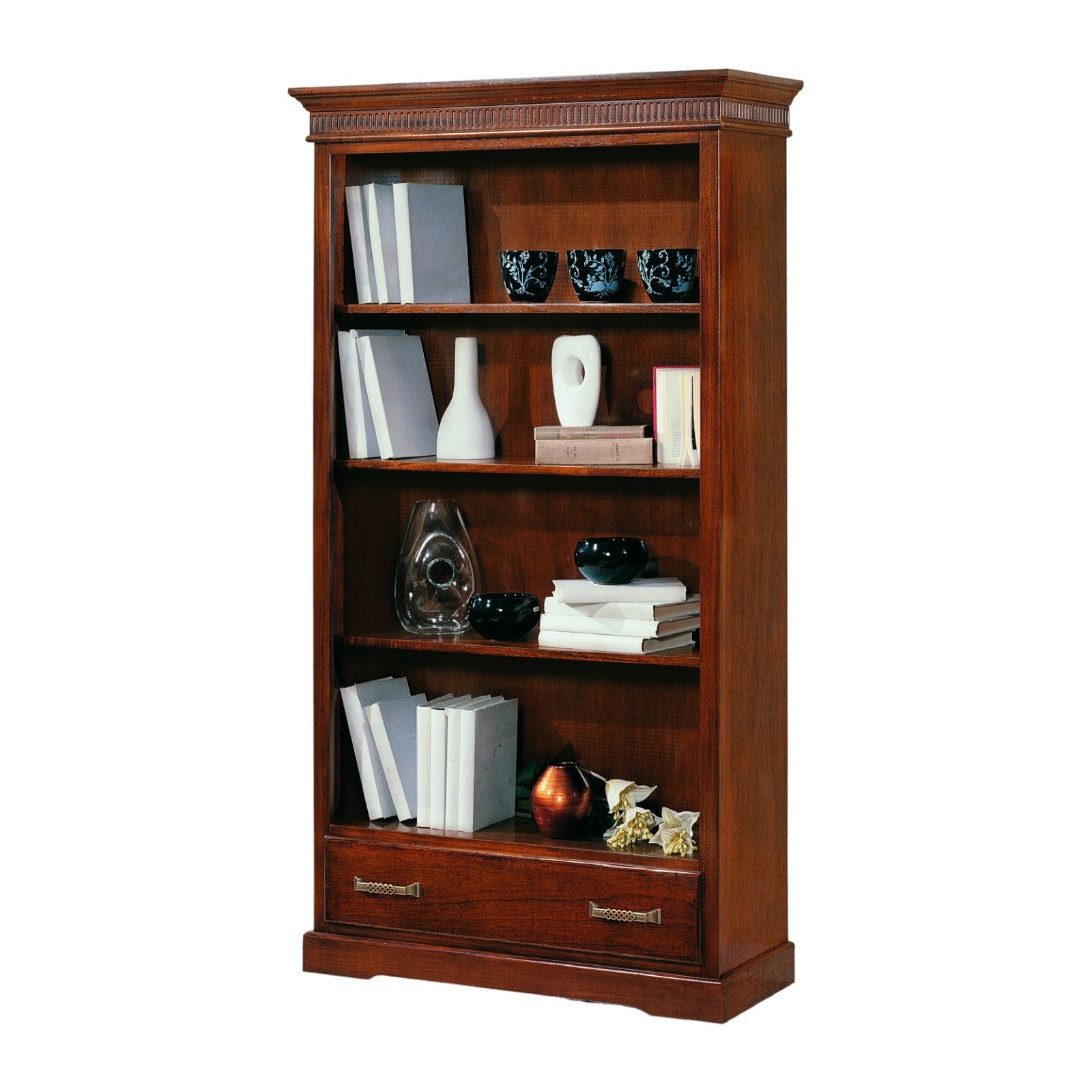 DESCRIZIONE : Libreria 3 ripiani a vista con 4 vani a giorno , 1 cassetto scorrevole con guide in legno , cappello sagomato con greca intarsiata , base con zoccolo a terra .