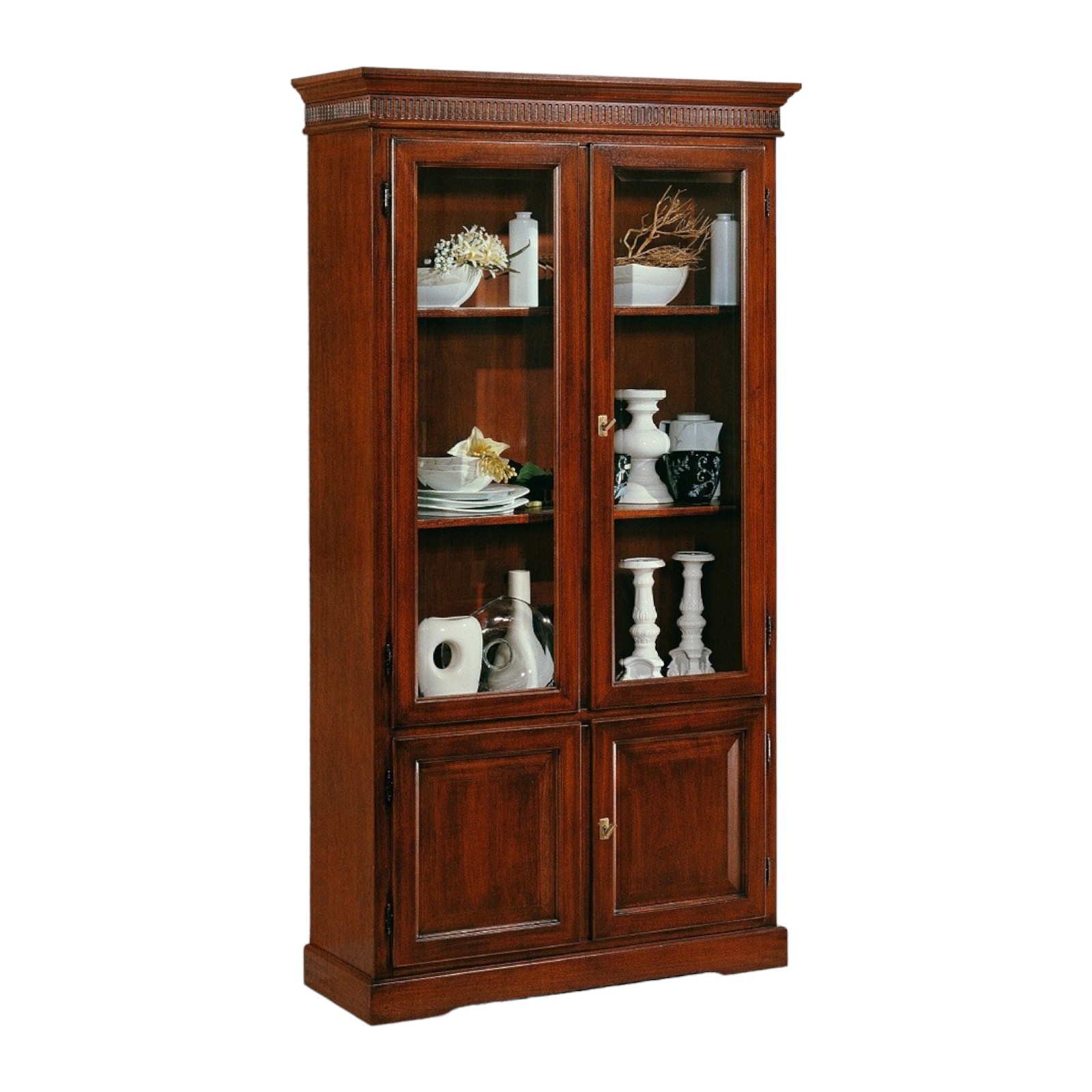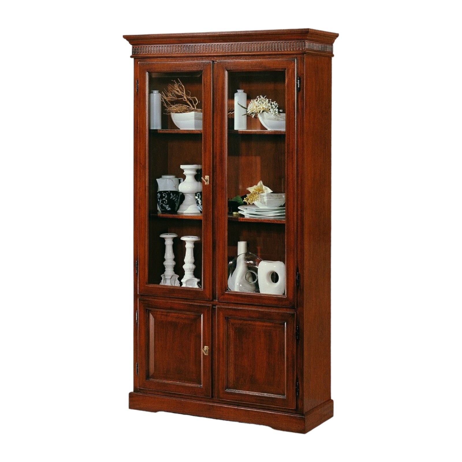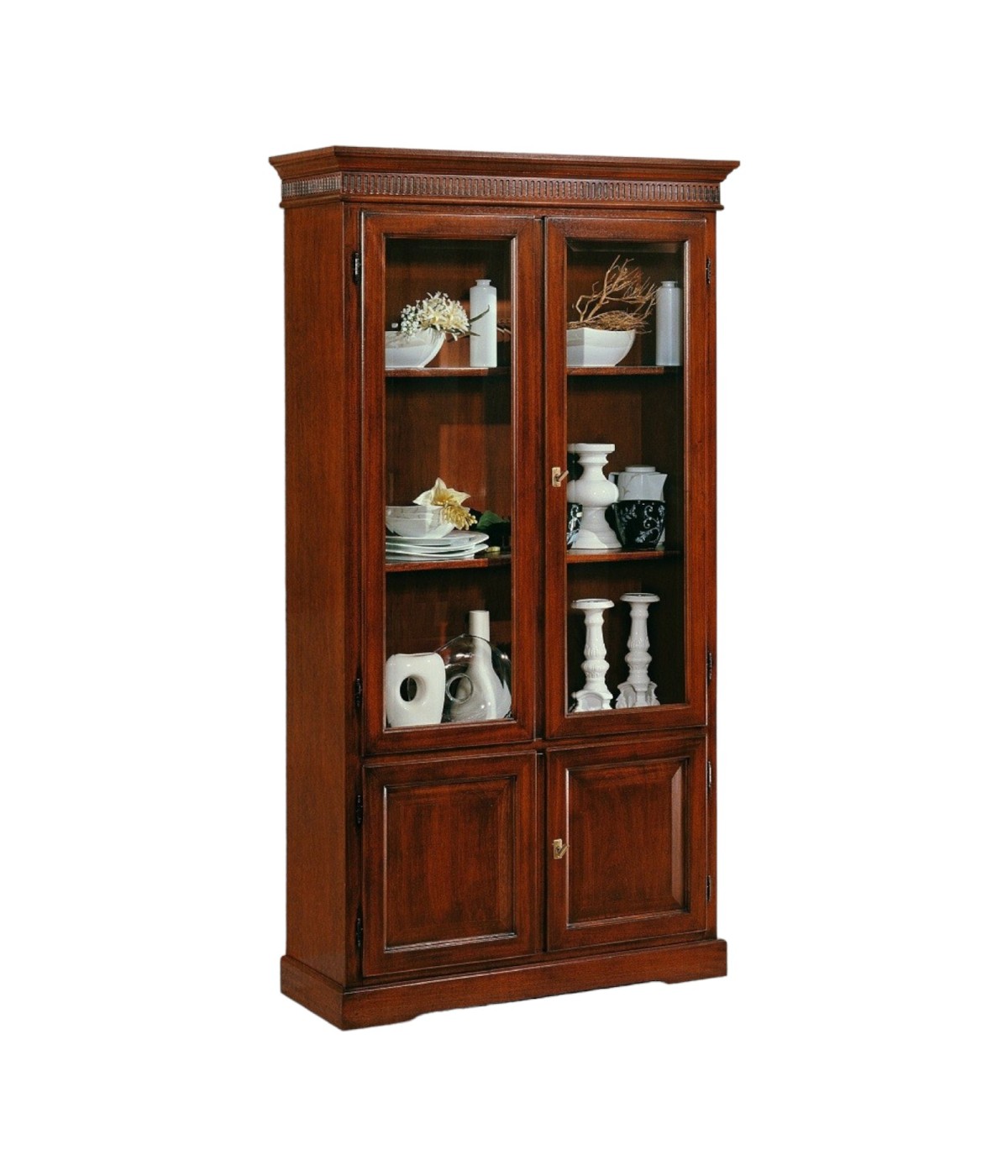 DESCRIZIONE : Vetrina Libreria con ripiani a vista , quattro porte con apertura battente e specchio diamantato , cappello sagomato con greca intarsiata , base con zoccolo a terra .