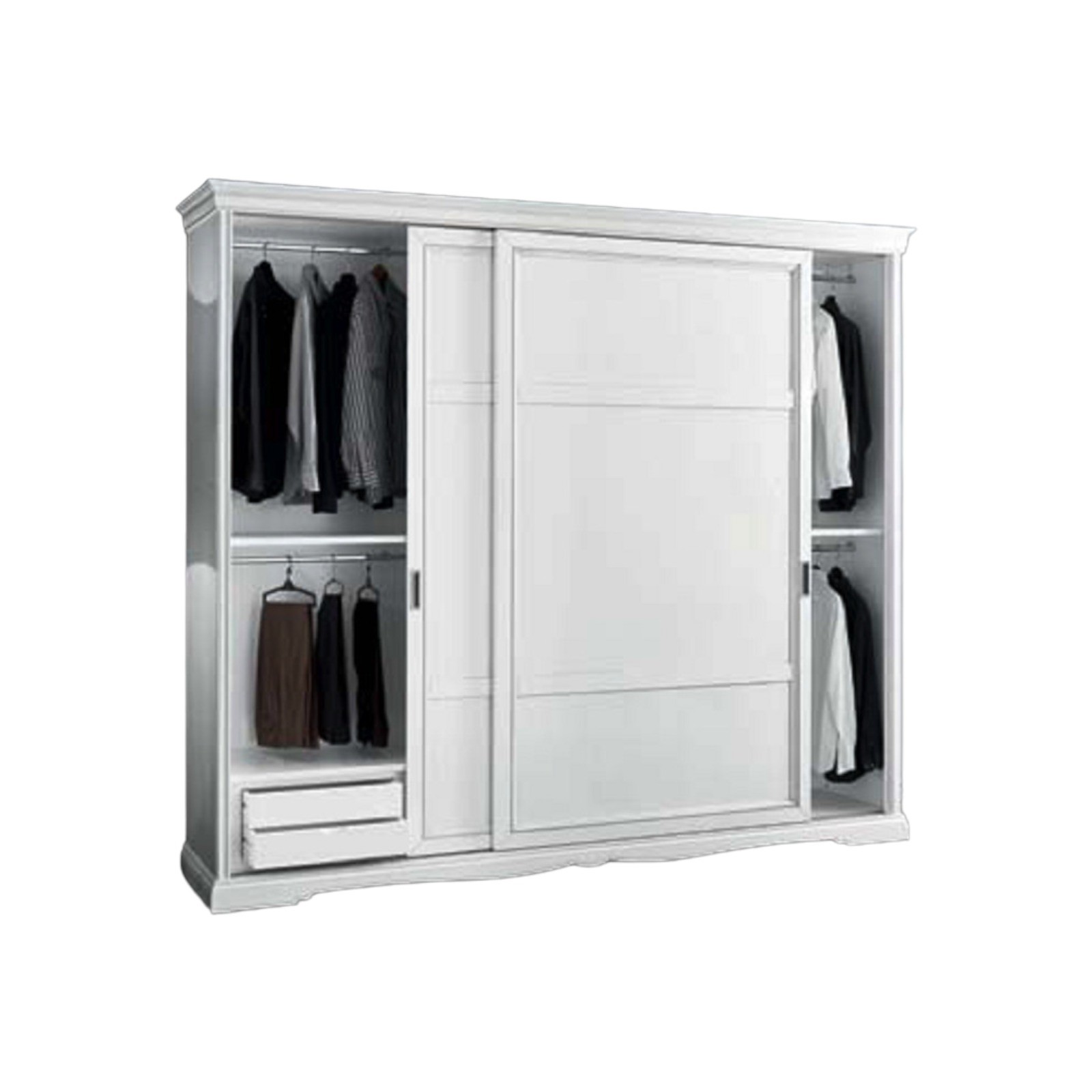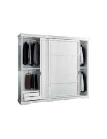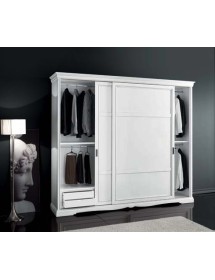 Descrizione : 2 porte scorrevoli con pannelli lisci in frassino ,all' interno l'armadio è dotato di 4 pali appendiabiti , 2 ripiani e una cassettiera con 2 cassetti .