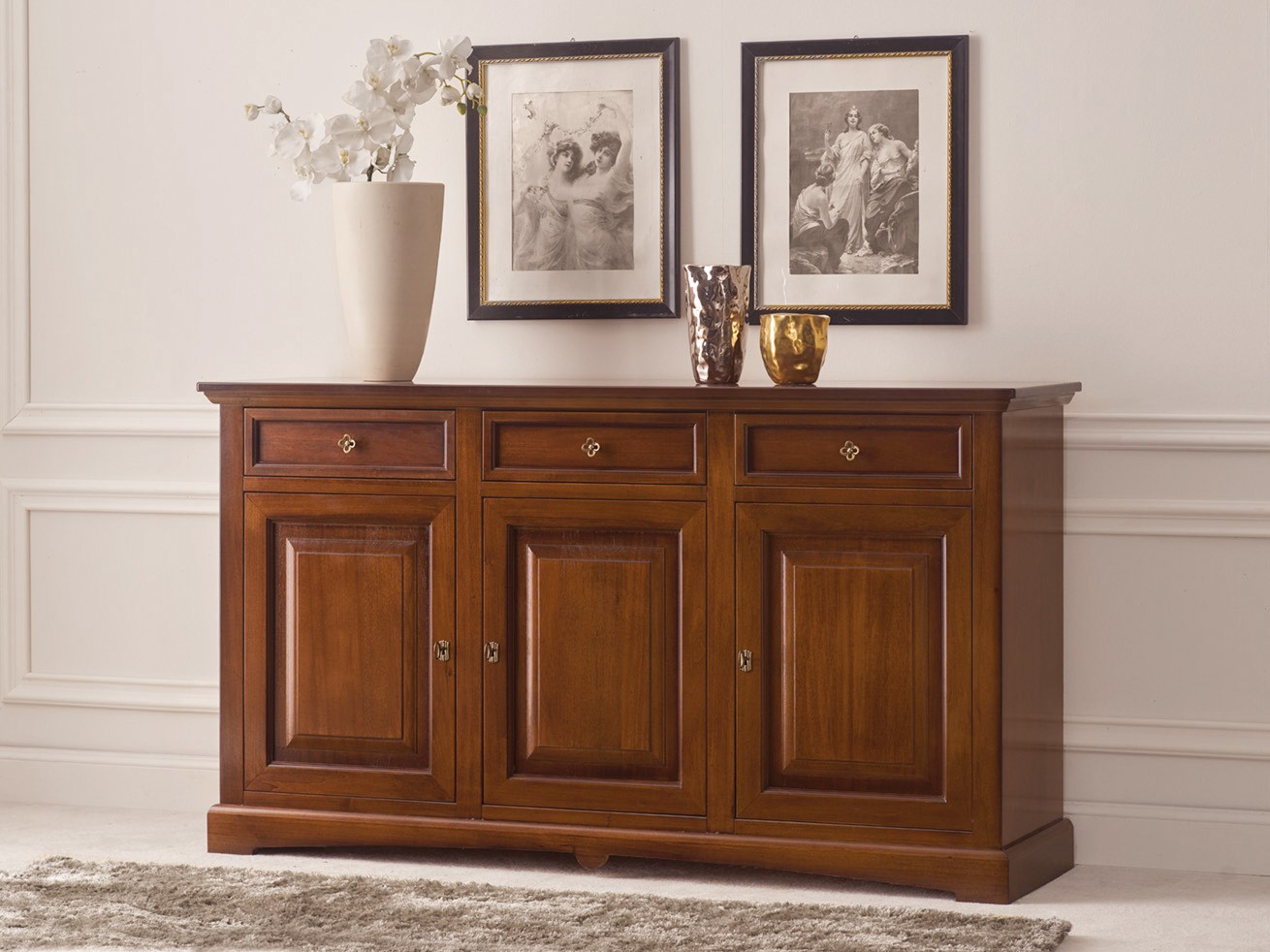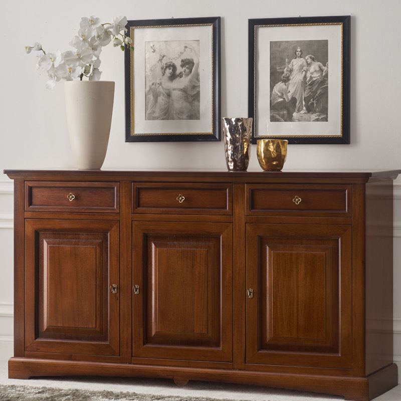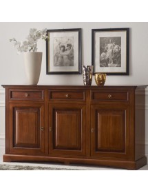 Credenza tradizionale in arte povera 3 porte 3 cassetti per il riordino di stoviglie e oggetti. Solida e Capiente ma allo stesso funzionale , adatta per creare un'impatto estetico con il motivo a goccia sulla base e sul cappello unico nel suo genere . Credenza che rappresenta la soluzione ideale per arredare con gusto qualsiasi stanza della casa.