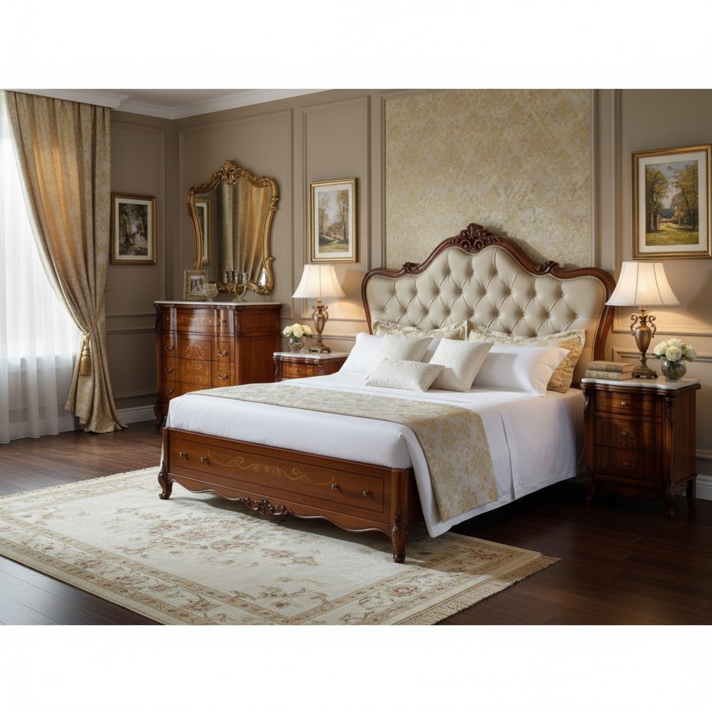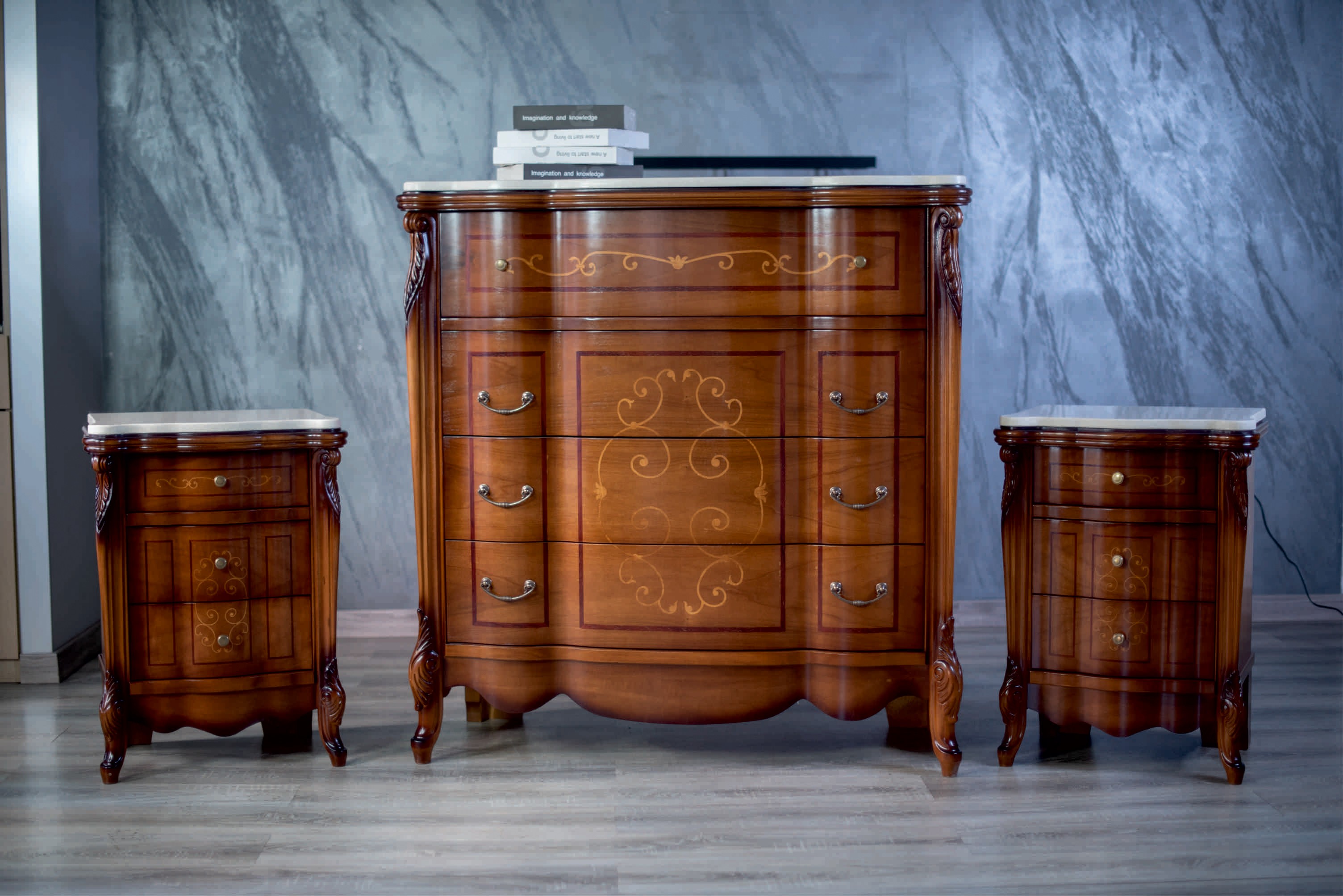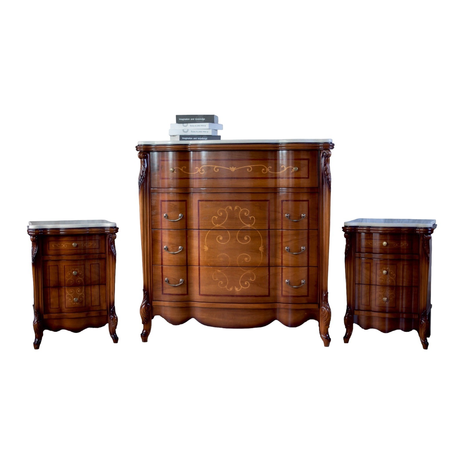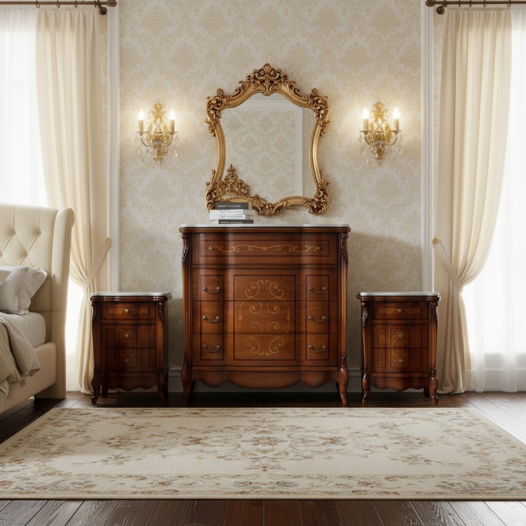 Gruppo completo di comò e comodini dallo stile barocco caratterizzati da intarsi manualmente eseguiti da mani di esperti artigiani. Composto da un comò e due comodini per disporre biancheria e indumenti ideale per la zona notte. Apprezzerai questi mobili per le sue linee e le sue forme che si contraddistinguono per il suo design d'altri tempi , creando un'atmosfera romantica e originale .