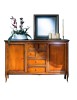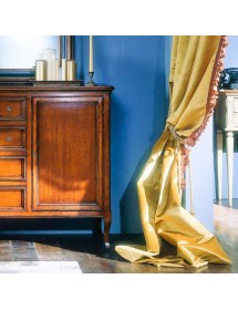 Credenza due porte, due cassetti grandi e quattro cassetti piccoli, piano sporgente del mobile. Montanti delle spalle arrotondati che proseguono su gambe sagomate. Le ante, i frontali dei cassetti e i fianchi sono riquadrati, all' interno delle ante è presente un ripiano per vano.