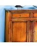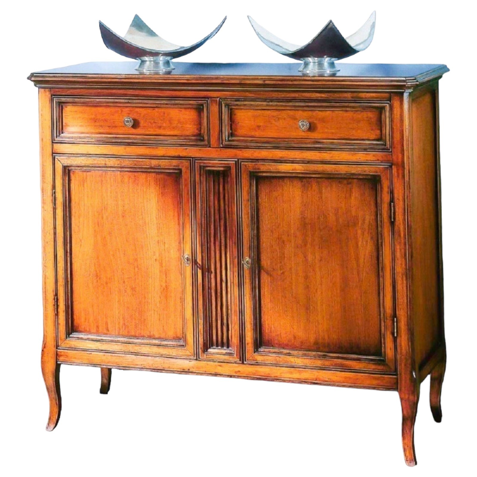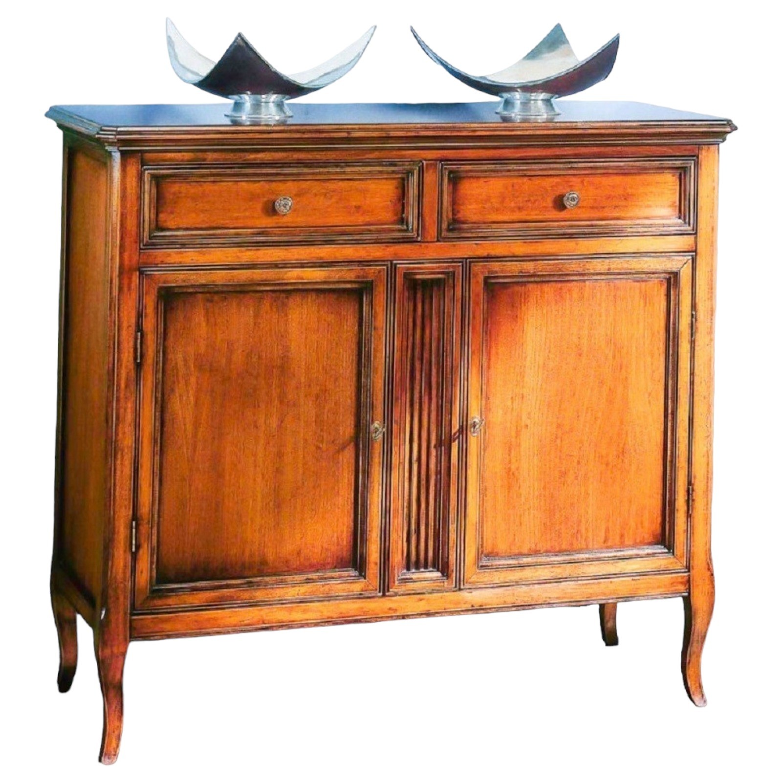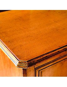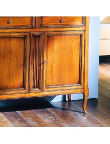 Credenza due porte e due cassetti , piano sporgente del mobile. Montanti delle spalle arrotondati che proseguono su gambe sagomate. Le ante, i frontali dei cassetti e i fianchi sono riquadrati, all' interno delle ante è presente un ripiano.
