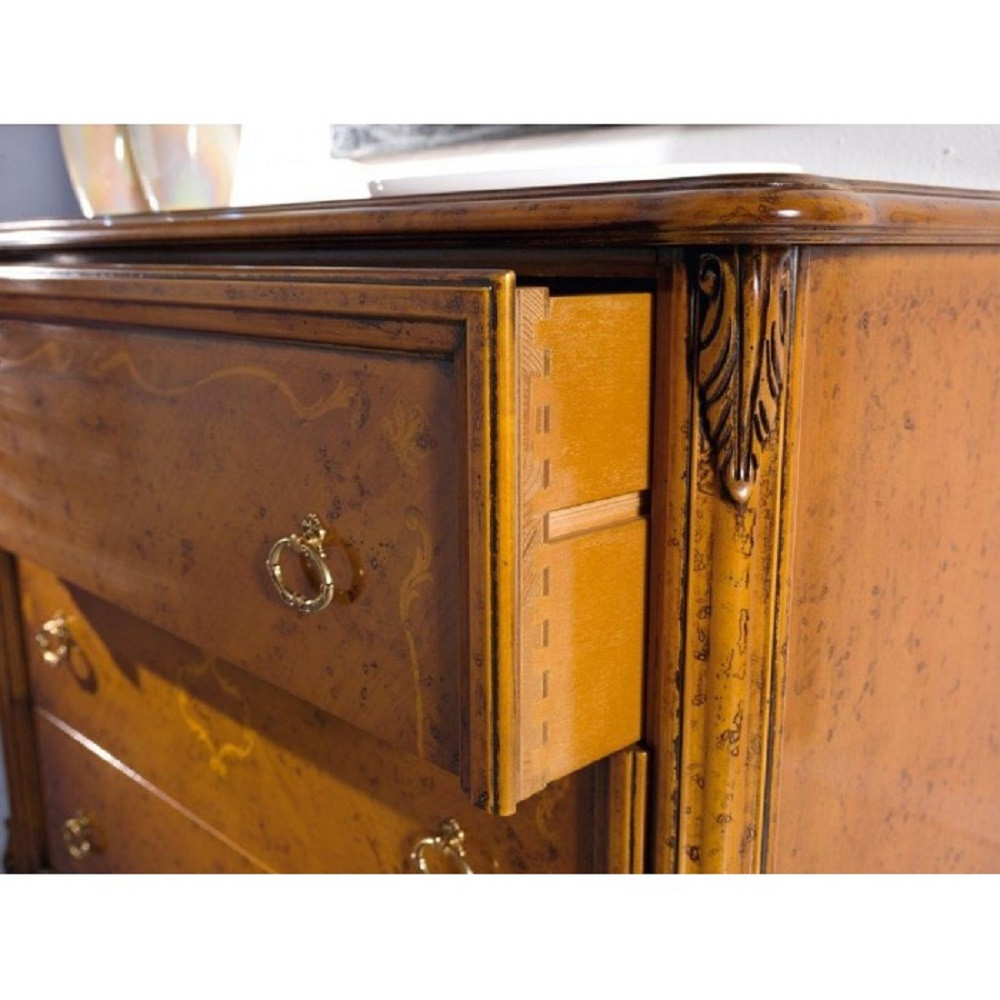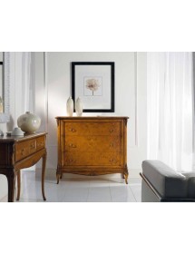 Cassettiera a tre cassetti con intarsi e forme arrotondate, arricchite da intagli in legno , il piano e gli angoli riprendono la sagomatura della gamba.