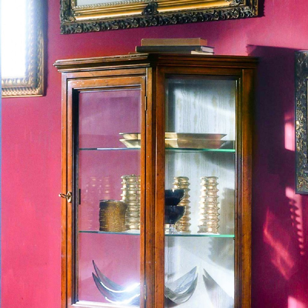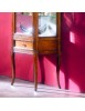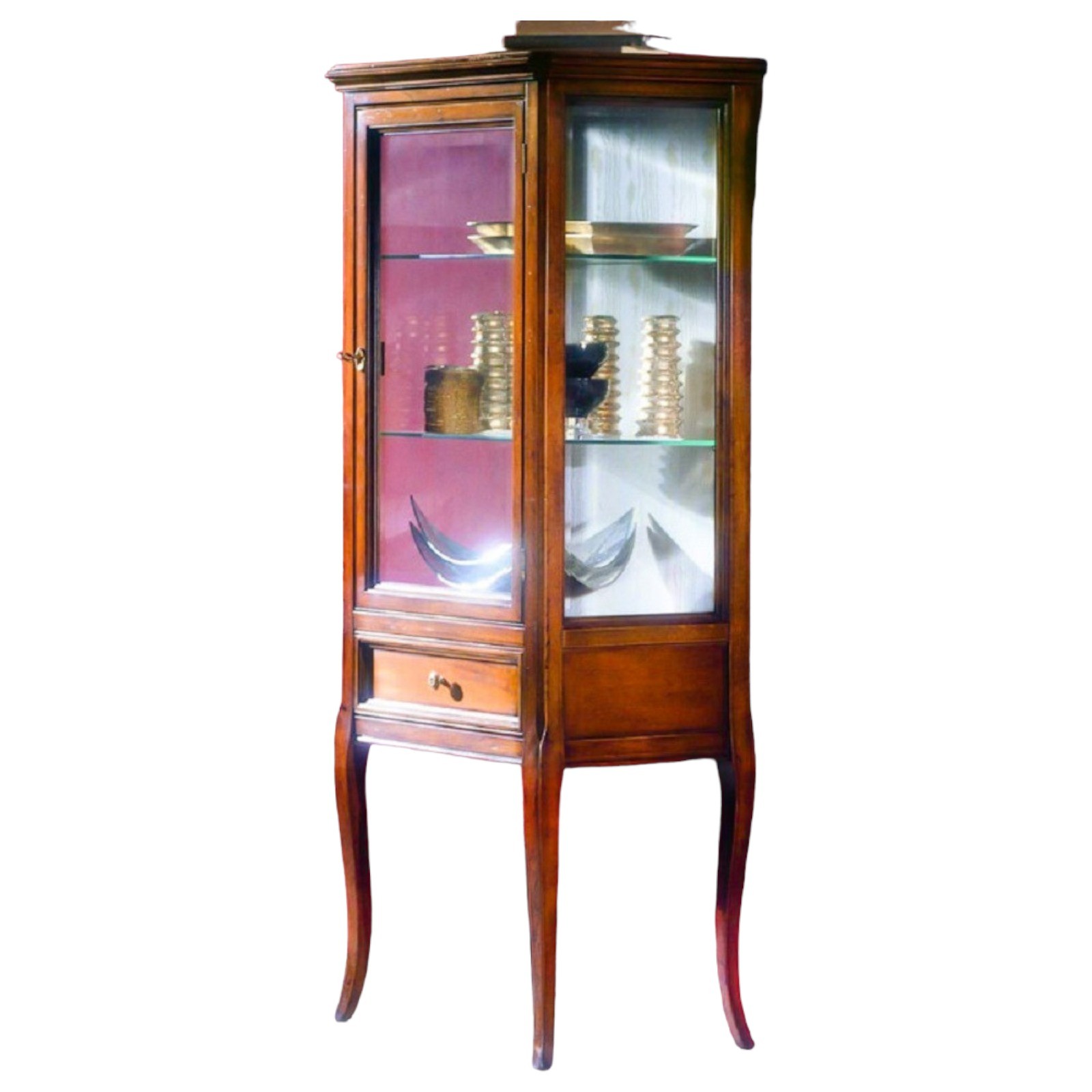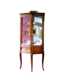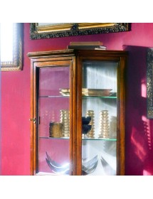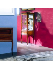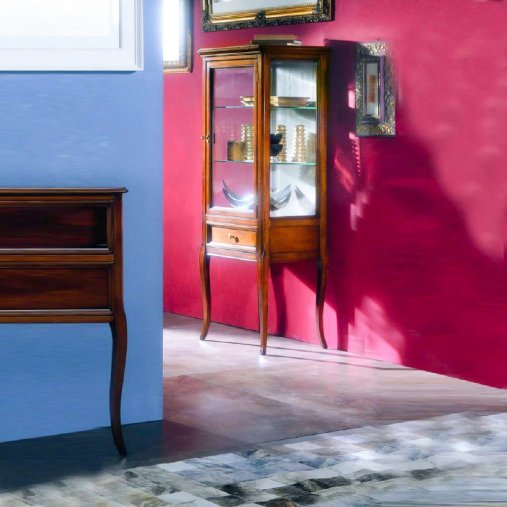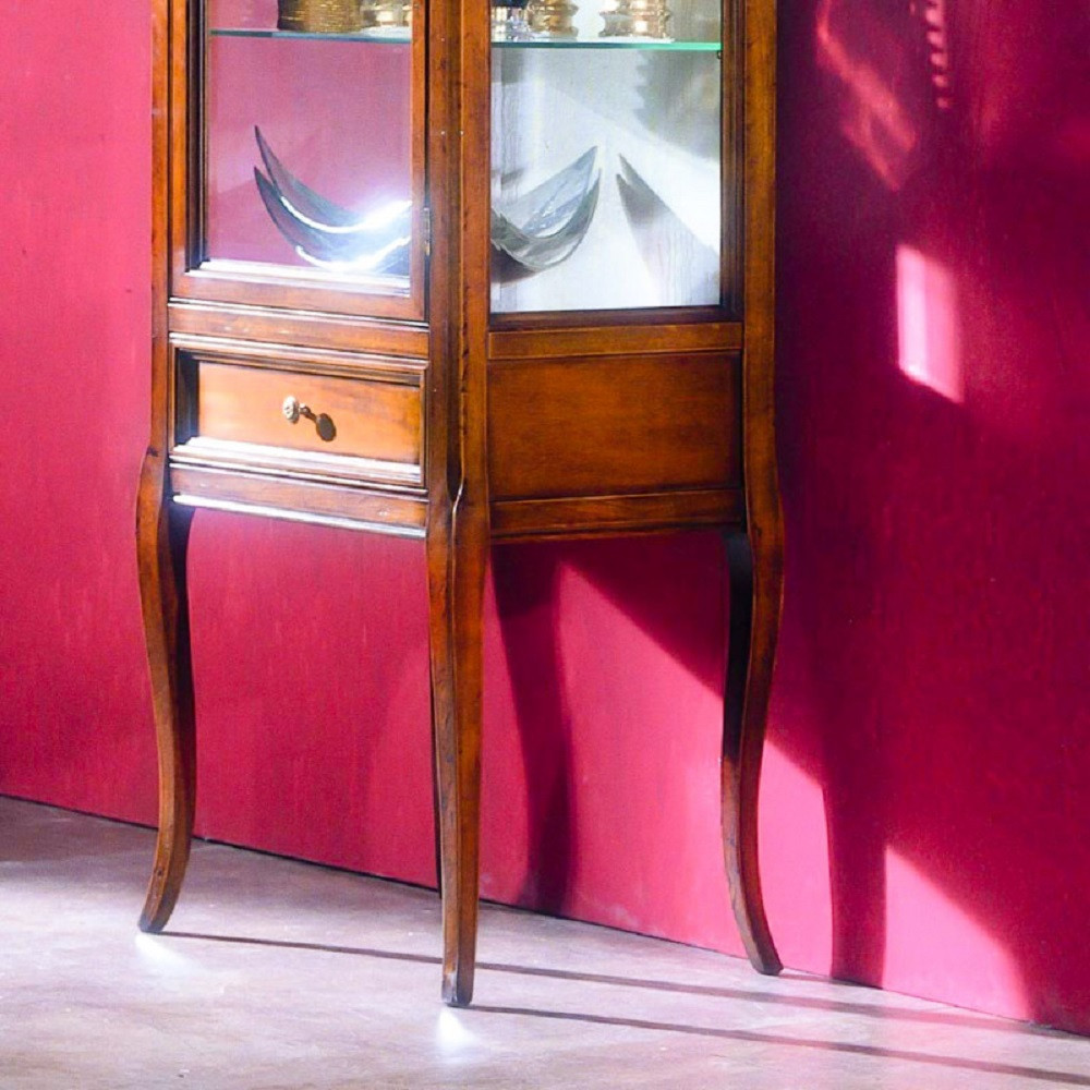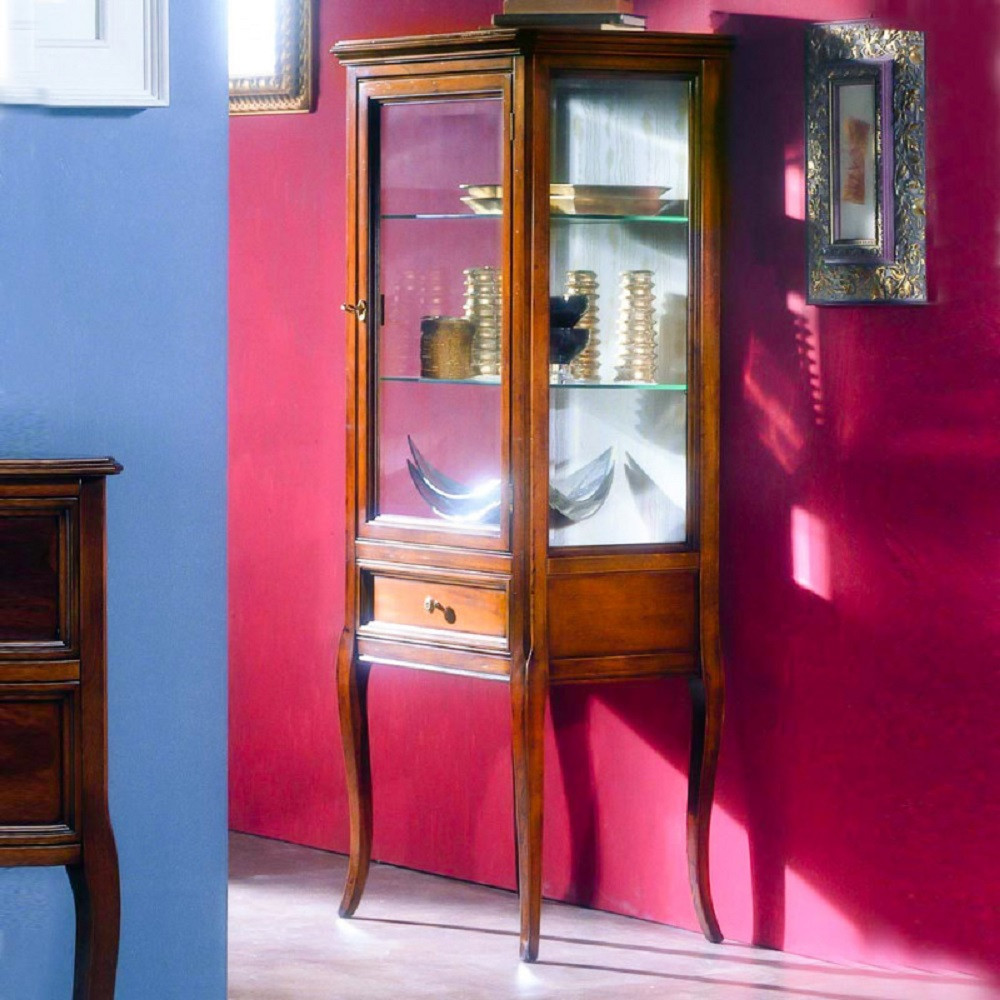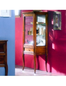 Vetrina in legno una porta e un cassetto con piano sporgente del mobile. Montanti delle spalle sagomati con gambe a sciabola, ante, cassetti e fianchi sono riquadrati con cornici.