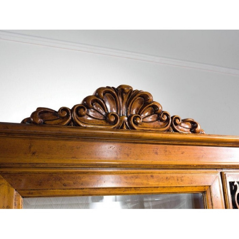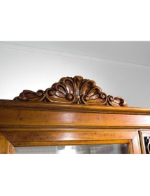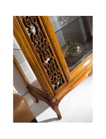 Elegante vetrina con un'anta battente con chiusura con chiave, arricchita da particolari con intagli nel legno e con il piano che riprende negli angoli la bombatura della gamba, all'interno si trovano tre ripiani .