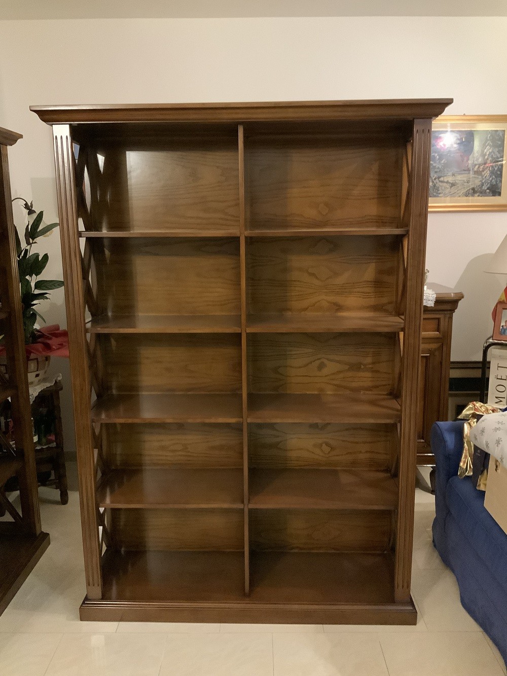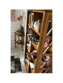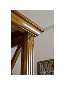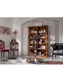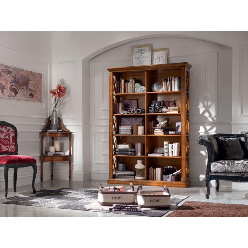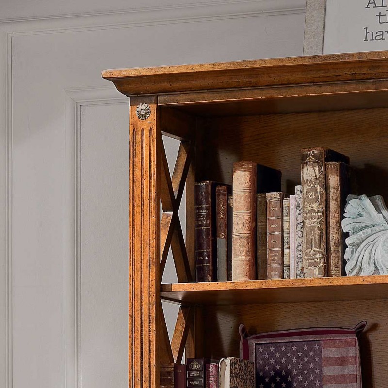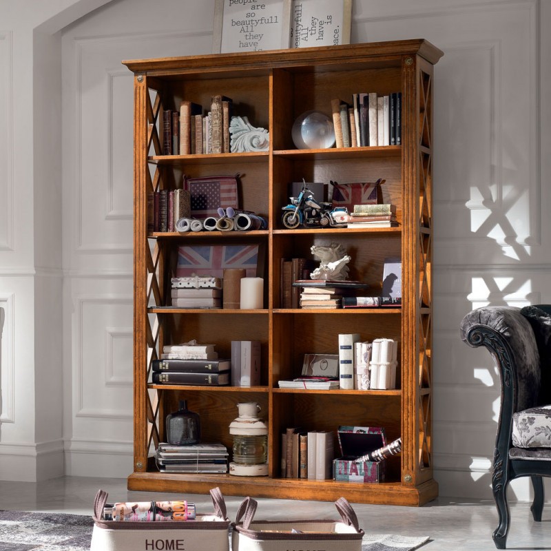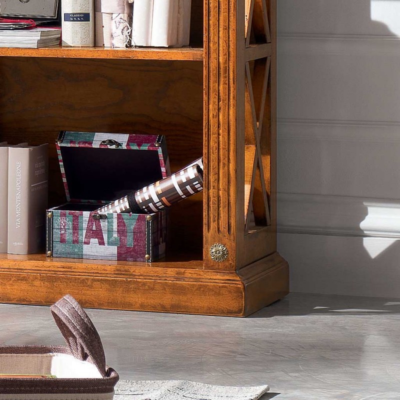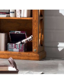 Libreria singola classica finitura bassano , fianchi con riquadri con inserita una crociera in modo da evitare la caduta a terra di libri e oggetti da collezione, aggiungendo un tocco di unicità con le medaglie ottonate sui montanti. ideale per una zona soggiorno classica ma allo stesso tempo si può inserire come elemento di contrasto in un soggiorno moderno.