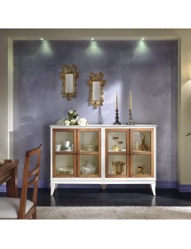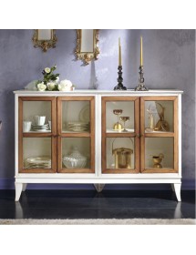 Credenza shabby costruita in legno, 4 porte in vetro con stecche riquadrate, gambe a sciabola con 2 ripiani interni. Trova facilmente posto in cucina o in salotto proteggendo con le 4 porte in vetro in maniera efficace il suo contenuto all'interno. Ideale nella zona giorno per sistemare: soprammobili, spezie, bicchieri o libri.