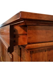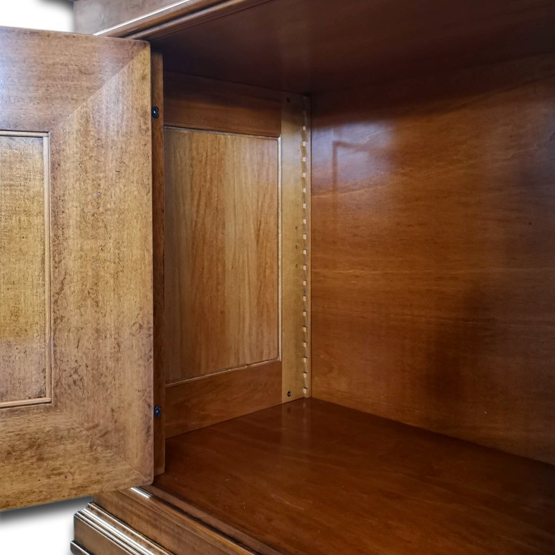 Credenza classica costruita in legno. All'interno offre ampio spazio per riporre: spezie, bicchieri e posate da cucina. Trova facilmente posto in cucina o come mobile bar per riporre libri e oggetti. Unica nel suo genere con l' intarsio e gli intagli sulle porte e sulla struttura del mobile, creando un bellissimo contrasto.