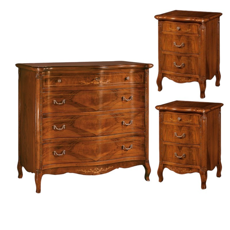 SET 1 cassettiera 2 comodini classici legno intarsio tinta noce